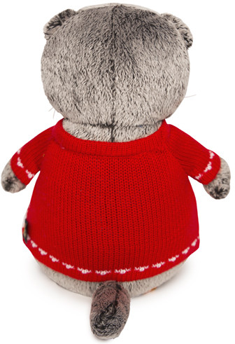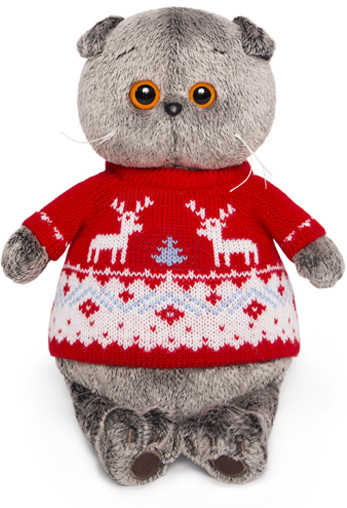 Плюшевый котенок приедет к вам в крафтовой коробке с отверстиями для воздуха и паспортом кота на задней крышке — как у настоящих котят. Для уютных семейных вечеров выбирайте кота Басика в свитере с оленями.