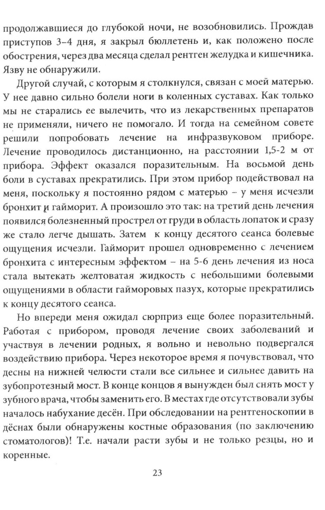 Информация в книге конечно интересная, есть о чем подумать, но ее не так уж много. Из 188 страниц половина занята всевозможными сканами документов, переписки, патентов и дипломов. Автору просто нечем было заполнить тот минимум страниц, нужных для книги, и он напихал туда все, что у него было из личного архива. Естественно, нет никаких чертежей установки инфразвука ИФС-1, и даже описаний её особенностей. Явное желание заинтересовать читателя, чтобы покупали данный аппарат у автора, точнее уже у его правопреемников. А стоит он баснословных денег. И стыдно за такого академика, делающего необдуманно громкие выводы, что инфразвуком можно запустить процесс переполюсовки земли. Это говорит лишь о том, что автор совершенно не представляет, что такое электричество, эфир... Не стоит данная книга таких денег.