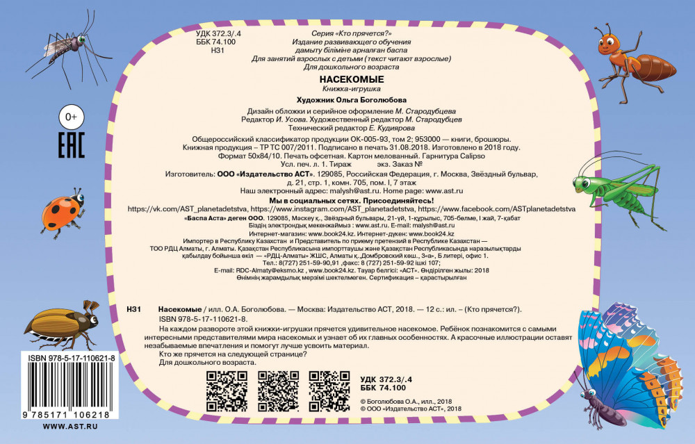 💳 Оплатить за товар можно при получении 🇰🇿 Есть бесплатная доставка по Казахстану от 1 дня 🎁 Копите бонусы с каждой покупки Серия: Кто прячется? На каждом развороте этой книжки-игрушки прячется удивительное насекомое. Ребёнок познакомится с самыми интересными представителями мира насекомых и узнает об их главных особенностях. А красочные иллюстрации оставят незабываемые впечатления и помогут лучше усвоить материал. |