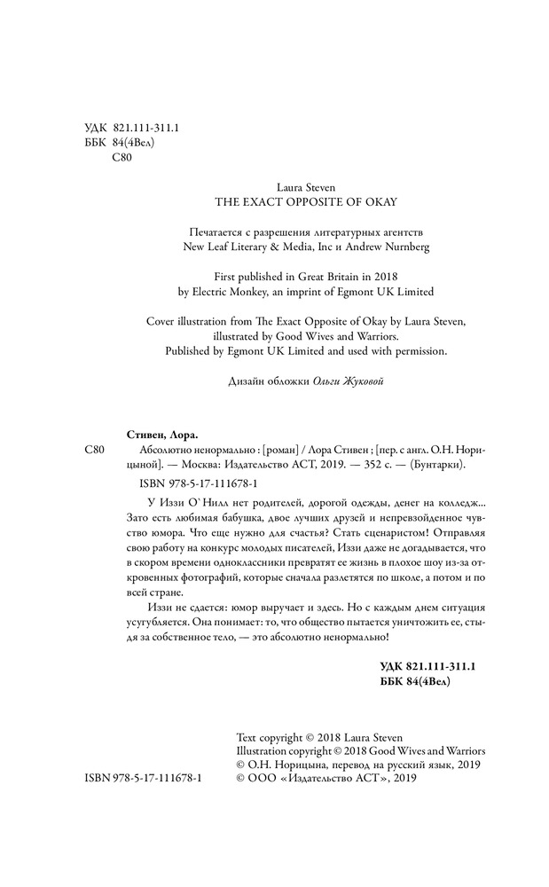 Серия: Бунтарки У Иззи О’Нилл нет родителей, дорогой одежды, денег на колледж... Зато есть любимая бабушка, двое лучших друзей и непревзойденное чувство юмора. Что еще нужно для счастья? Стать сценаристом! Отправляя свою работу на конкурс молодых писателей, Иззи даже не догадывается, что в скором времени одноклассники превратят ее жизнь в плохое шоу из-за откровенных фотографий, которые сначала разлетятся по школе, а потом и по всей стране. Иззи не сдается: юмор выручает и здесь. Но с каждым днем ситуация усугубляется. Она понимает: то, что общество пытается уничтожить ее, стыдя за собственное тело, — это абсолютно ненормально! |