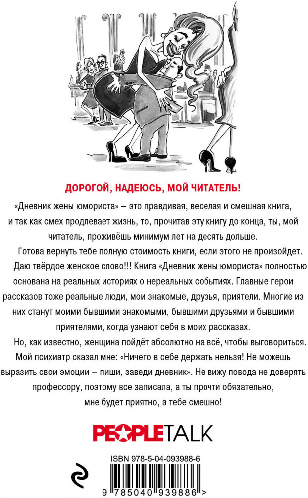💳 Оплатить за товар можно при получении 🇰🇿 Есть бесплатная доставка по Казахстану от 1 дня 🎁 Копите бонусы с каждой покупки Серия: Мартиросян Жанна. Откровения жены известного юмориста Дорогой, надеюсь, мой читатель! «Дневник жены юмориста» — это правдивая, веселая и смешная книга, и так как смех продлевает жизнь, то, прочитав эту книгу до конца, ты, мой читатель, проживёшь минимум лет на десять дольше. Готова вернуть вам полную стоимость книги, если этого не произойдет. Даю твёрдое женское слово!!! Книга «Дневник жены юмориста» полностью основана на реальных историях о нереальных событиях. Главные герои рассказов тоже реальные люди, мои знакомые, друзья, приятели. Многие из них станут моими бывшими знакомыми, бывшими друзьями и бывшими приятелями, когда узнают себя в моих рассказах. Но, как известно, женщина пойдет абсолютно на все, чтобы выговориться. Мой психиатр сказал мне: «Ничего в себе держать нельзя! Не можешь выразить свои эмоции — пиши, заведи дневник». Не вижу повода не доверять профессору, поэтому все записала, а вы прочтите обязательно, мне будет приятно, а вам смешно! |