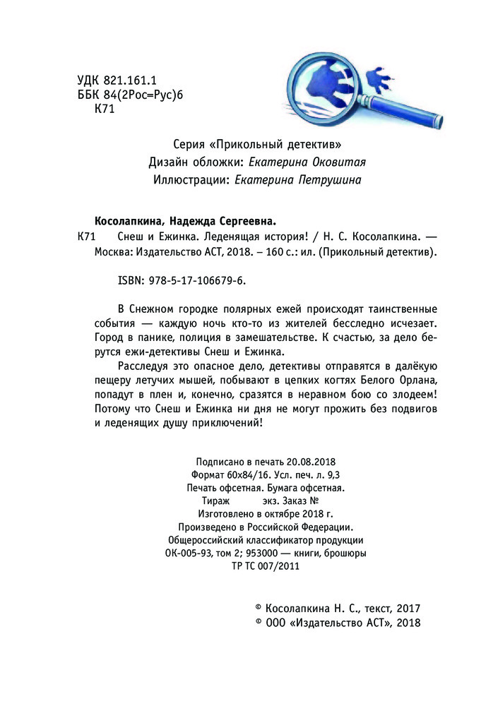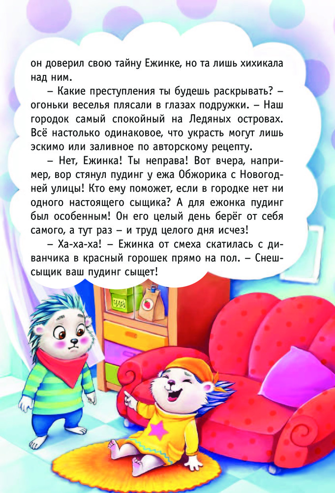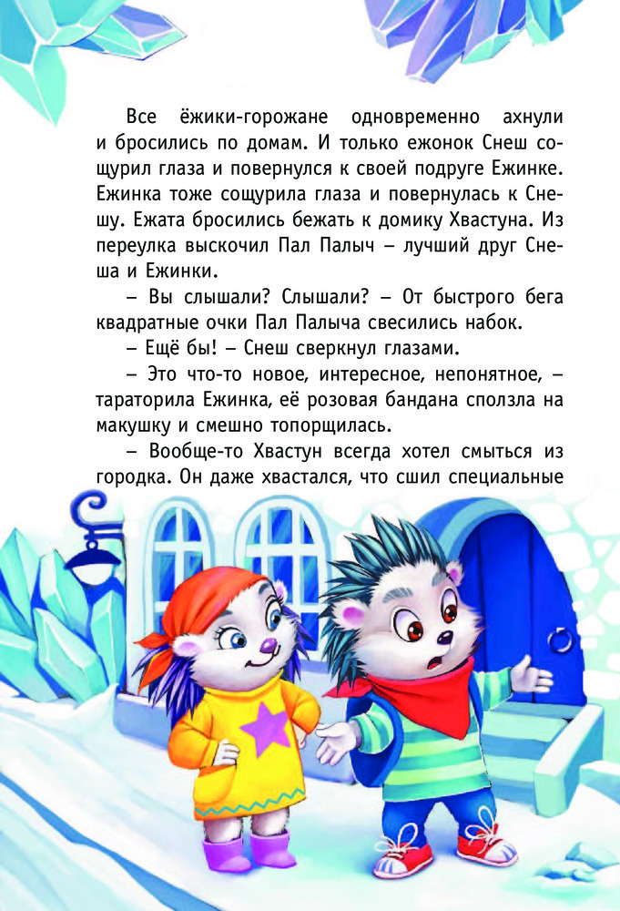 Снеш и Ежинка. Леденящая историяВ данный момент этот товар отсутствует в продаже. Возможно, у нас найдется аналогичный или похожий товар здесь. Серия: Прикольный детектив В Снежном городке полярных ежей происходят таинственные события — каждую ночь кто-то из жителей бесследно исчезает. Город в панике, полиция в замешательстве. К счастью, за дело берутся ежи-детективы Снеш и Ежинка. Расследуя это опасное дело, детективы отправятся в далёкую пещеру летучих мышей, побывают в цепких когтях Белого Орлана, попадут в плен и, конечно, сразятся в неравном бою со злодеем! Потому что Снеш и Ежинка ни дня не могут прожить без подвигов и леденящих душу приключений! |