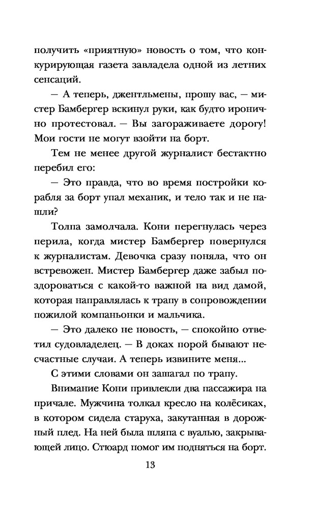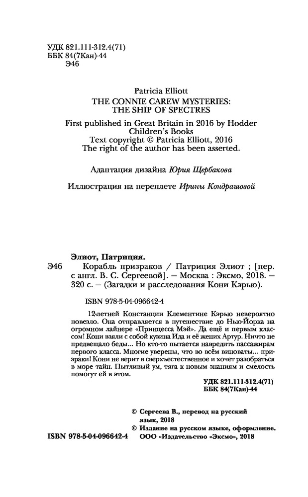 Корабль призраковВ данный момент этот товар отсутствует в продаже. Возможно, у нас найдется аналогичный или похожий товар здесь. Серия: Детск. Загадки и расследования Кони Кэрью 12-летней Констанции Клементине Кэрью невероятно повезло. Она отправляется в путешествие до Нью-Йорка на огромном лайнере «Принцесса Мэй». Да ещё и первым классом! Кони взяли с собой кузина Ида и её жених Артур. Ничто не предвещало беды... Но кто-то пытается навредить пассажирам первого класса. Многие уверены, что во всём виноваты... призраки! Кони не верит в сверхъестественное и хочет разобраться в море тайн. Пытливый ум, тяга к новым знаниям и смелость помогут ей в этом. |