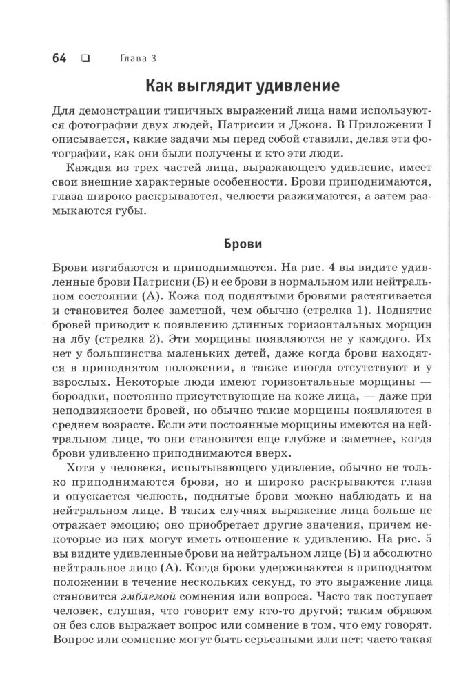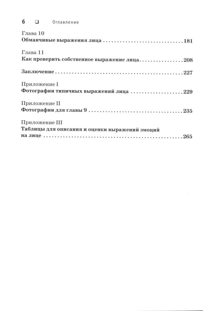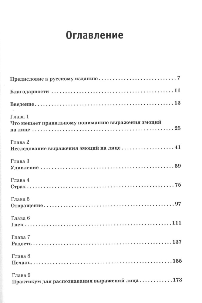 Введение Глава 1.Что мешает правильному пониманию выражения эмоций на лице Глава 2. Исследование выражения эмоций на лице Глава 3. Удивление Глава 4. Страх Глава 5. Отвращение Глава 6. Гнев Глава 7. Радость Глава 8. Печаль Глава 9. Практикум для распознавания выражений лица Глава 10. Обманчивые выражения лица Глава 11. Как проверить собственное выражение лица Заключение Приложение 1. Фотографии типичных выражений лица Приложение 2. Фотографии для главы 9 Приложение 3. Таблицы для описания и оценки выражений эмоций на лице