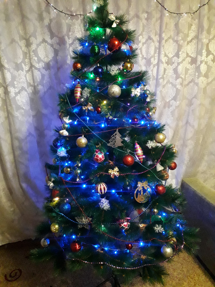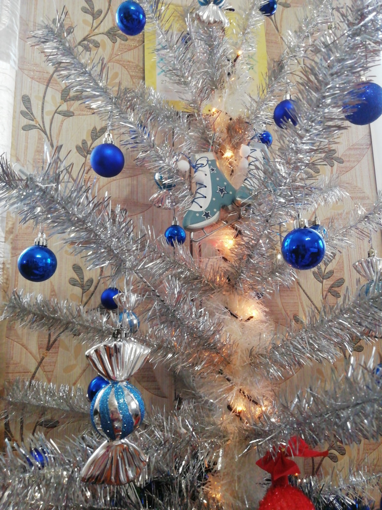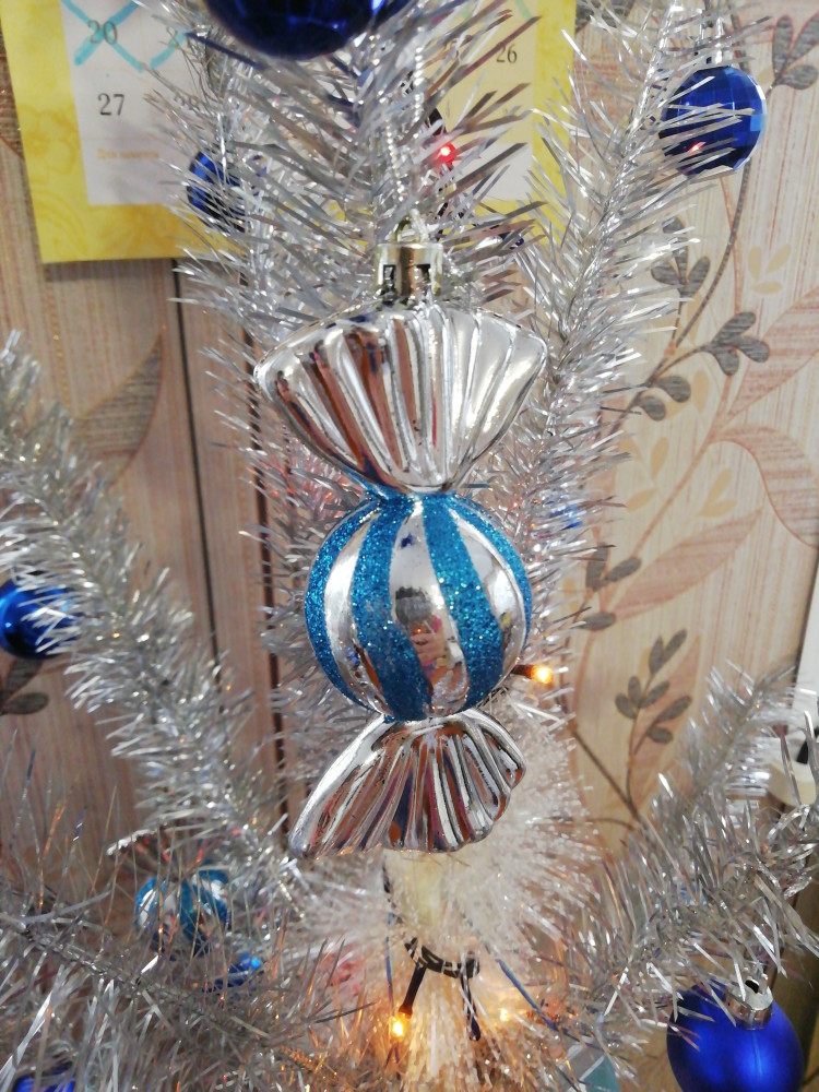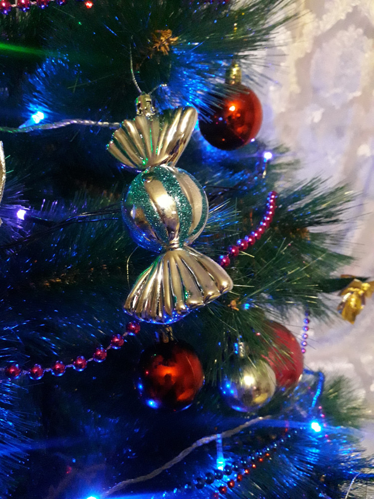 Игрушки-конфеты прикольные, но мне две попались с браком, на одной трещина, на другой отломана петелька, на которую вешается ниточка, из-за небольшой цены не стала оформлять отказ, с трещиной повесила на задний план, вторую положила у подножья елки.