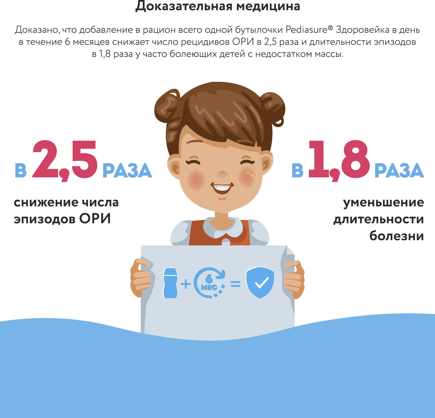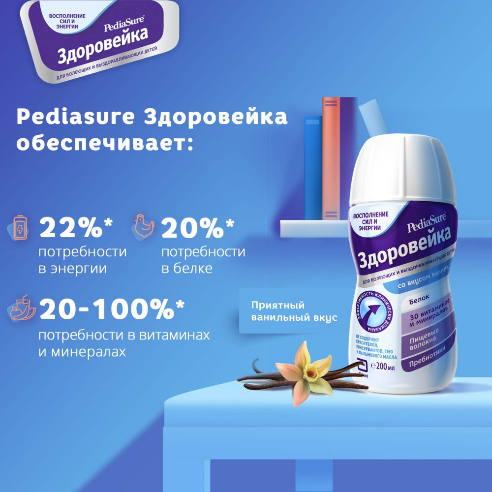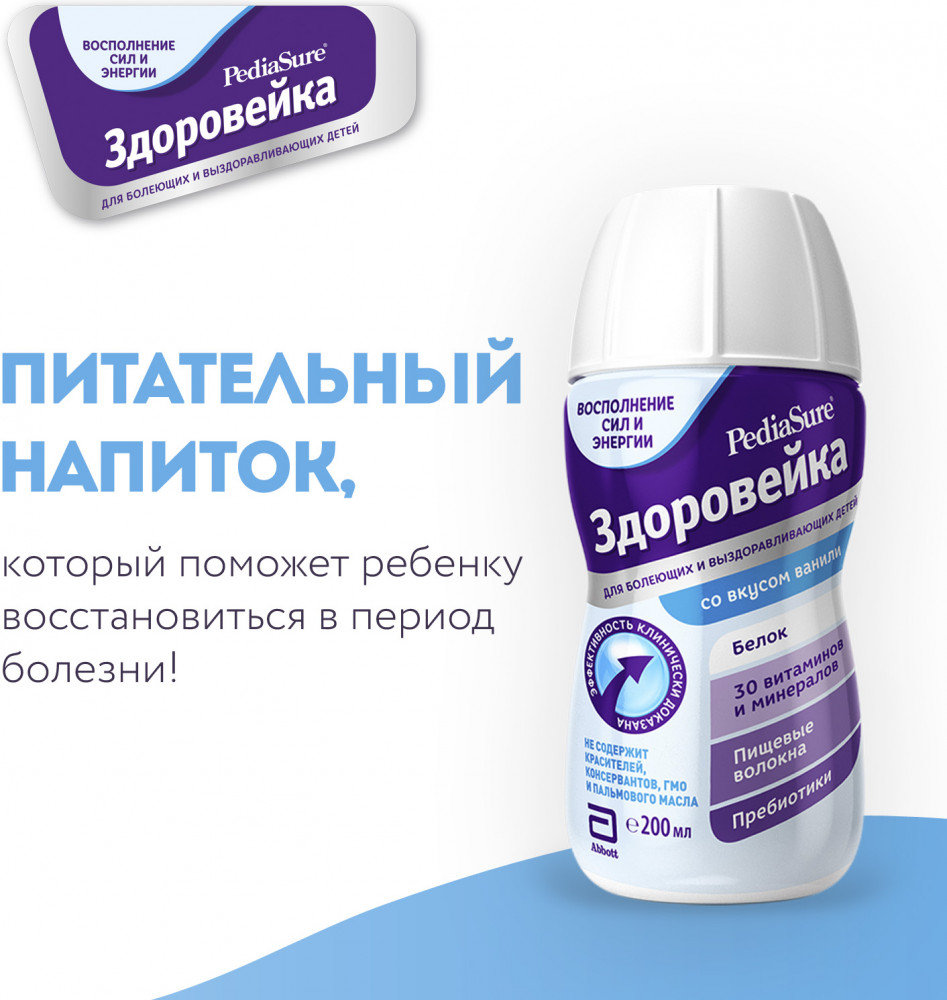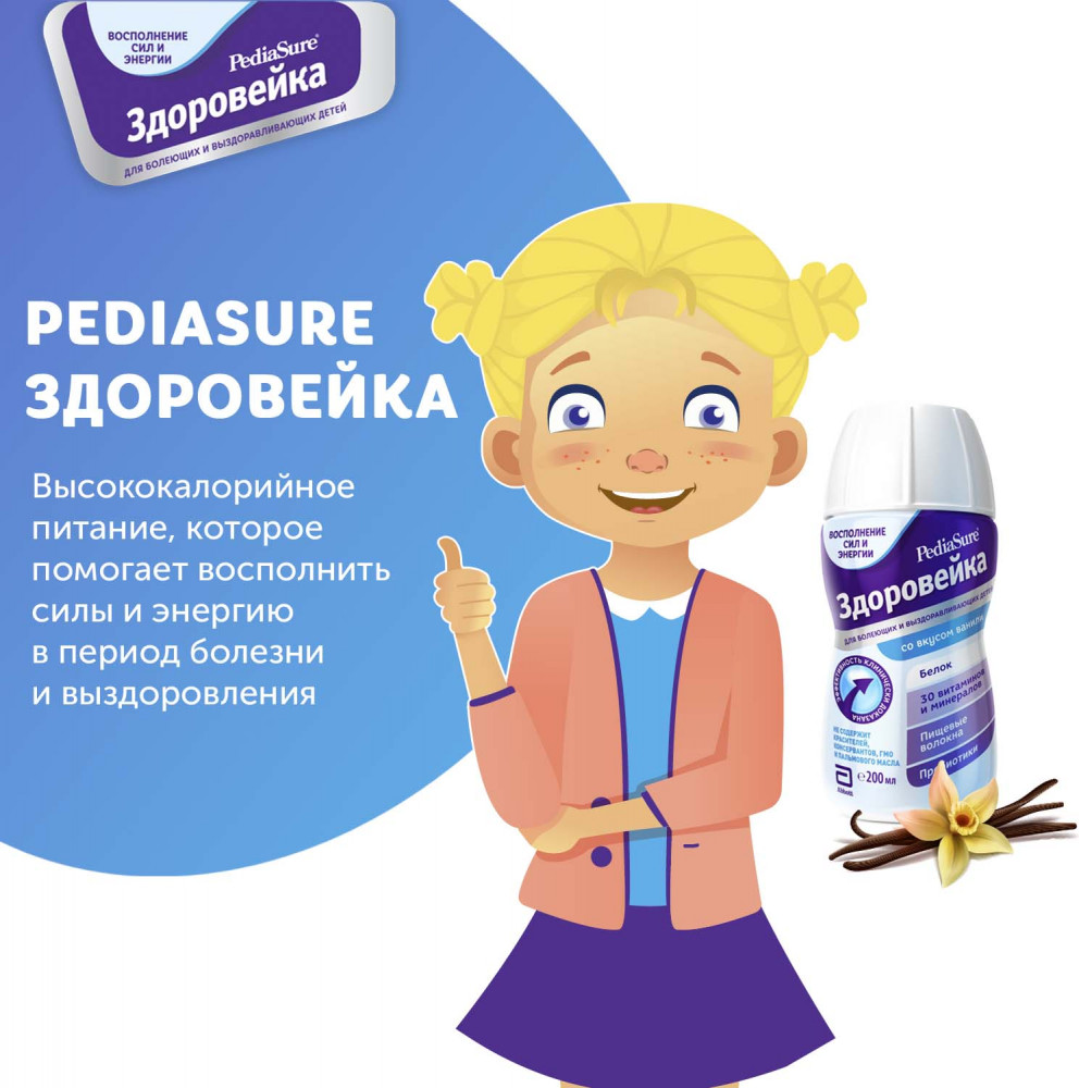 Pediasure Здоровейка — высококалорийное дополнительное питание для детей в период болезни и выздоровления. Восполняет повышенную потребность в питательных веществах. Способствует скорейшему выздоровлению. В период болезни необходимость в белке и энергии возрастает, поэтому важно восполнить потребность ребенка в питательных веществах.