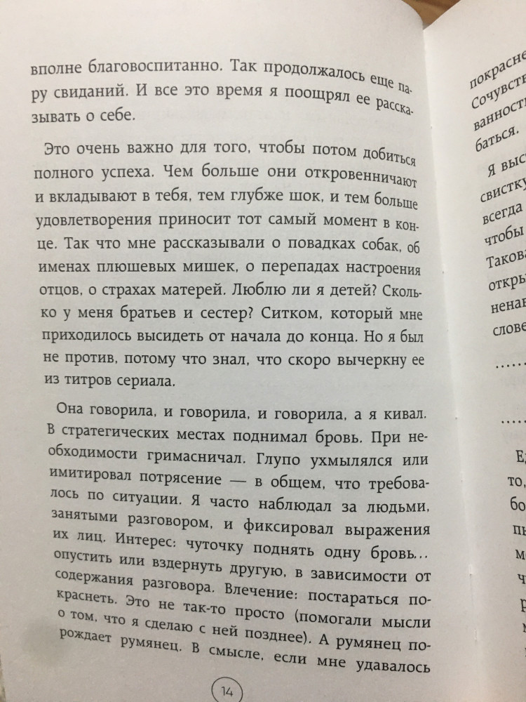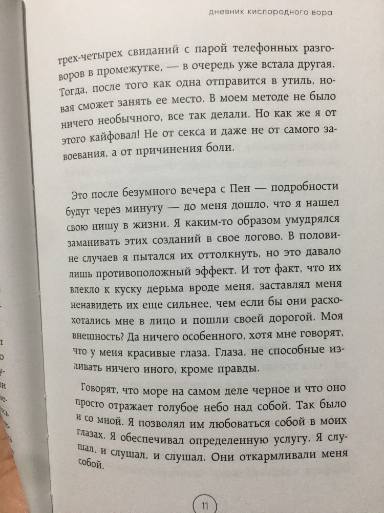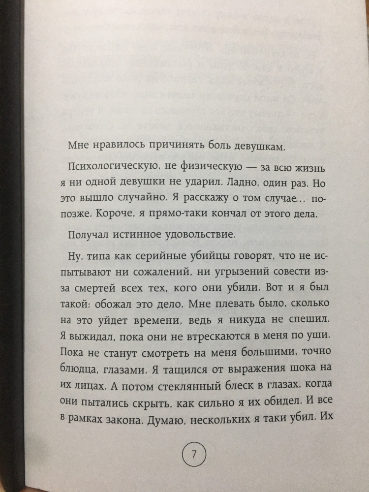 Качество печати хорошее, мягкая обложка и приятные листы. НО сожержание мне совсем не зашло. По названию кажется что в этой книге будет что-то мрачное, на самом же деле она о закомлексованном ( в какой-то степени) мужчине, который старадал от недостатка любви в детстве, отчего никогда и не был в здоровых отношениях. То есть он никакой не злобный обидчик женщин, а просто напросто трус. Он всегда сбегал от хороших женщин и при этом с удовольствием словесно их оскорблял. В конце последняя девушка, в которую он влюбился, воспользуется им и подставит его. В каких-то местах он пытается описывать себя социопатом, который якобы лишь наблюдая за людьми научился выражать эмоции сострадания, заинтересованности и тд, в других же местах он отчетливо пишет о том какой он жалкий и как он несколько раз влюблялся в женщин которые его бросали. Книга написана настолько неинтересно и нудно, что я просто пролистала ее за пару часов. Есть поверхностное описание пары 18+ моментов. В целом это дневник человека который не хотел над собой работать, насколько помню там кое-где пишется что он не обращался к психологам, потому что считал что ему все равно не помогут, но я думаю, что он просто не хотел лишать себя статуса загадочного грубого мужчины. В книге есть сюжетная линия, но следить за ней и интересоваться тем что будет дальше совсем не хочется. Может я и упустила какие-то умные мысли, потому что не вчитывалась, невелика потеря, ну вот совсем мне не понравилась книга. Конечно, читать ее или не читать решать вам. Я оставлю здесь несколько страниц для ознакомления, опять-таки, дело ваше, но на моей полке стоять она не будет.