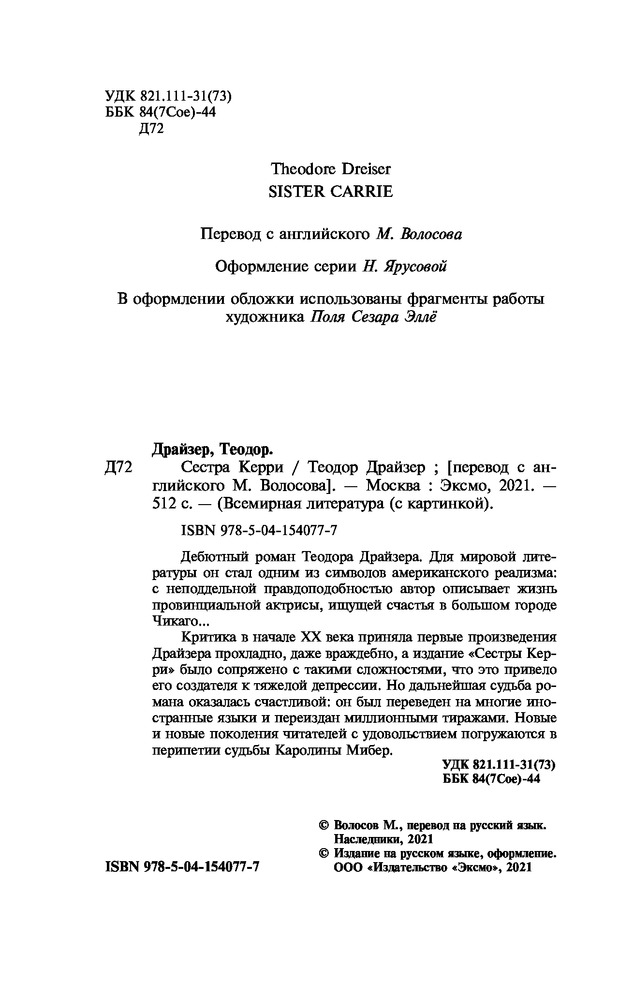 Сестра Керри-20% +59 интересный сюжет глубокий смысл классика крепкая обложка