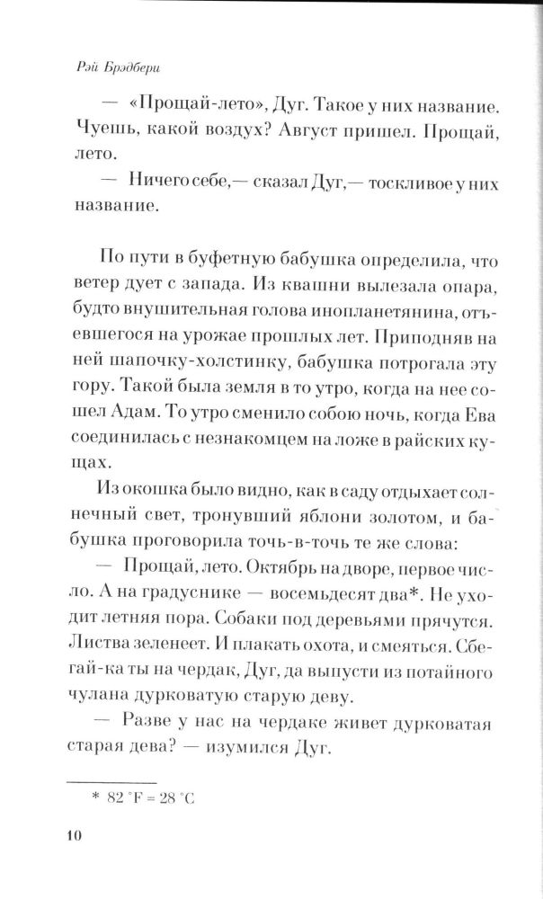После восторга от прочтения "Вино из одуванчиков" я очень многого ждал от этой книги. Если не большего, то хотя бы на уровне, потому что она была преподнесена как продолжения "Вина из одуванчиков". Но увы, после прочтения осталась только досада. Такое впечатление, что автор от нечего делать собрал все скомканные черновики и наспех выпустил книгу. А в конце разговор старика с тем, что пошевелилось у него между напоследок, так называемый "холмик" или "бугорок" (сейчас точно не помню и не хочу вспоминать), вообще вызывает отвращение.