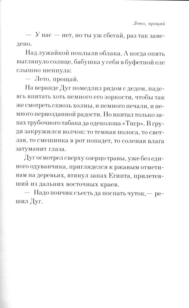 Получила книгу быстро. Внешне книга очень приятна, переплет хоть и мягкий, но другой, я думаю, здесь и не надо. Шрифт крупный, даже у кого проблемы со зрением, думаю, смогут его прочесть. Теперь по содержимому. "Лето прощай" это продолжение "вина из одуванчиков". Но если в первой книге я для себя увидела глубокий Смысл - читая каждый отрывок, погружалась в детство или какие то моменты из прошлого, то здесь этого смысла нет. Просто книга приятная для прочтения и всего одна мысль идет через всю книгу. В общем, книгой довольна. Флипу за доставку и внешний вид 5 звезд.
