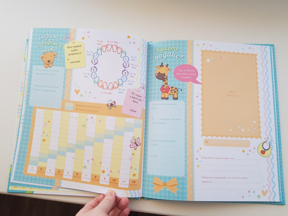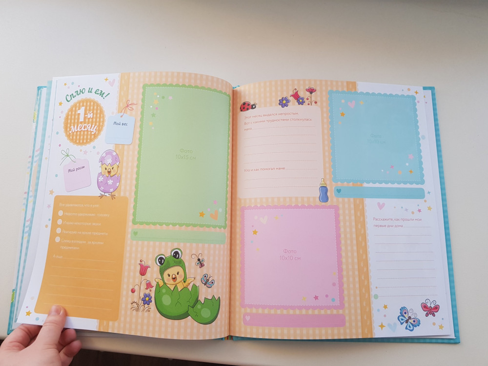 Пришел довольно быстро, писали что 16 декабря будет только на складе, но 11 декабря уже был доставлен, это не может не радовать. Сам альбом красочный, нужно много фотографий и под каждой есть подпись, определенный момент из жизни, чувства и эмоции пережитые в то время. Альбом считаю очень полезным, так как у самой подобный был и будучи взрослым человеком, перечитывать пожелания и разные комментарии от родителей и родственников очень приятно и иногда до слез.