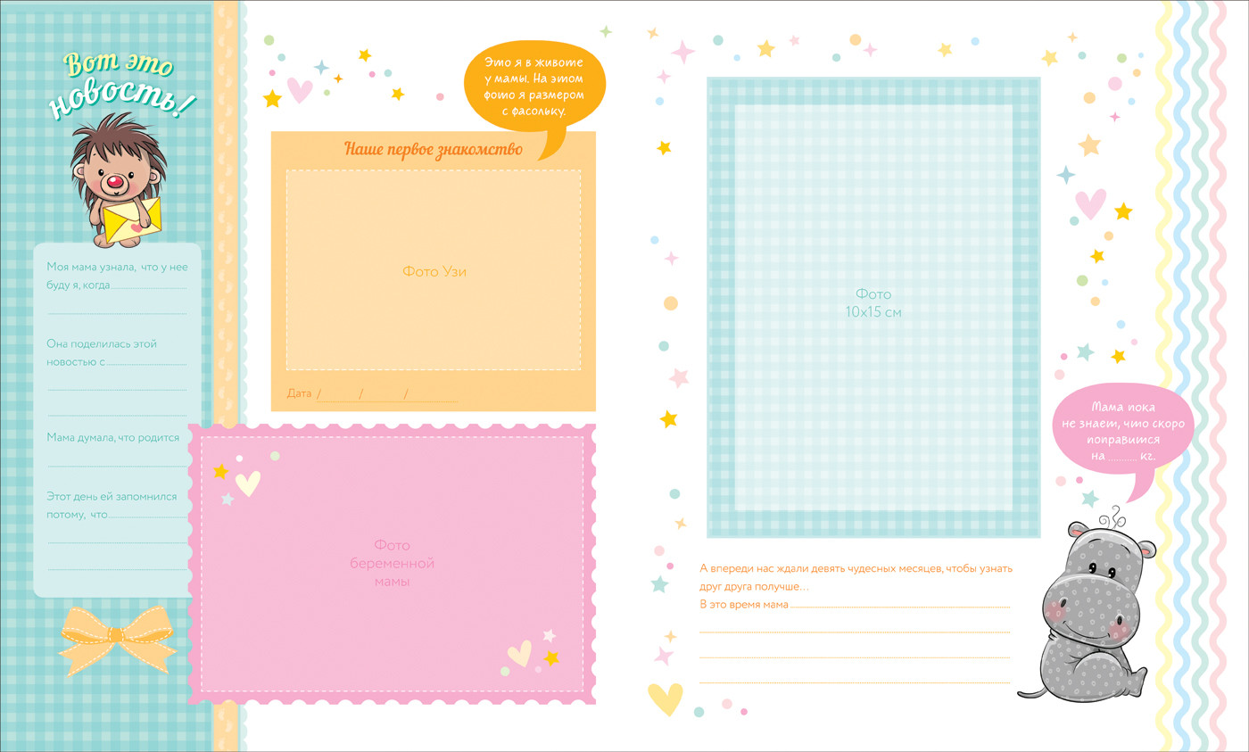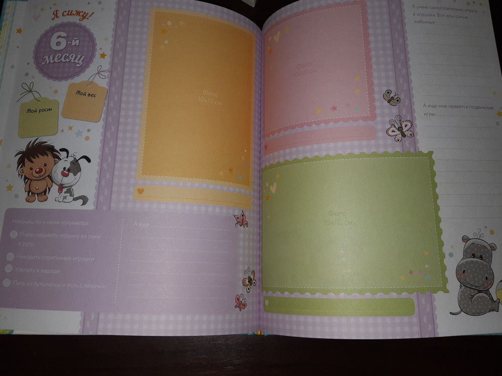 Мне альбом очень понравился, за такие деньги конечно это лучшее, яркие красочные рисунки, 10×15 размер для фото. Много мест куда можно и написать текст и приклеить фото малыша. Рекомендую.