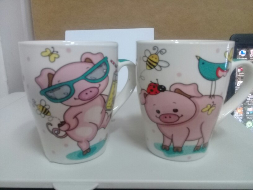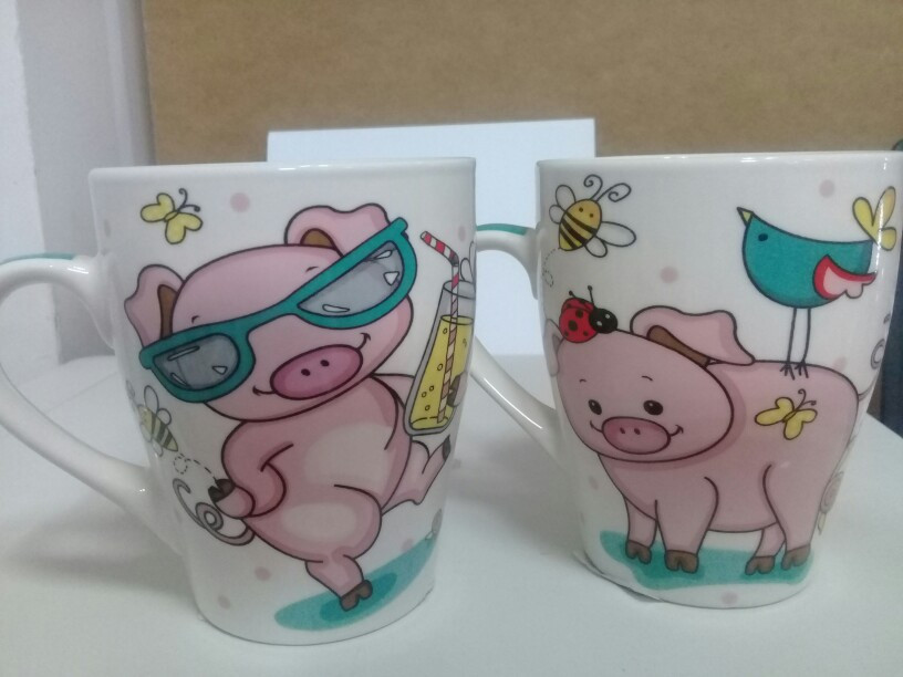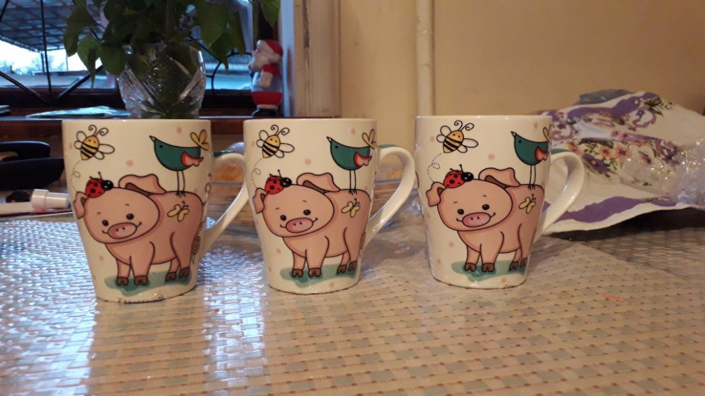 Очень понравились кружечки! Взяла себе и дочери. С удовольствием пью и кофе и чай. Удобно, веселенькие свинки добавляют настроение