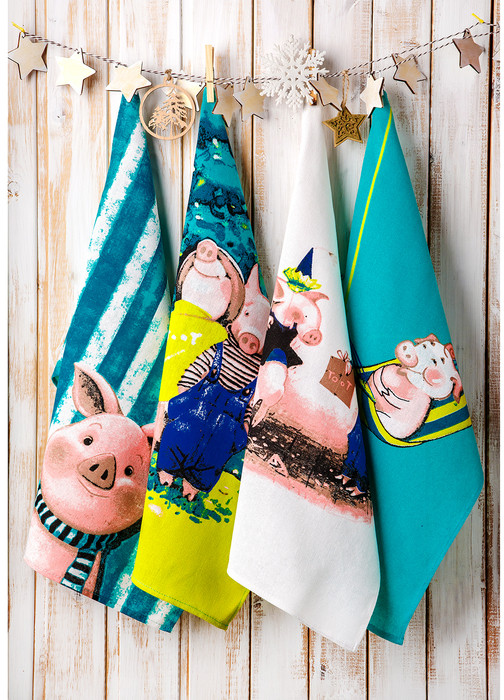 Какие они милые, эти полотенца. Такие свинки озорные. А ведь я не хотела брать, чтоб это ни было, со свиньями... Но эти покорили своими рисунками. Жаль нет четвёртой расцветки. По качеству, менее плотные, чем Доляна. На мой взгляд, рогожка для кухни хороша - хорошо вытирает, легко стирается, быстро сохнет. Спасибо.