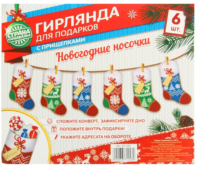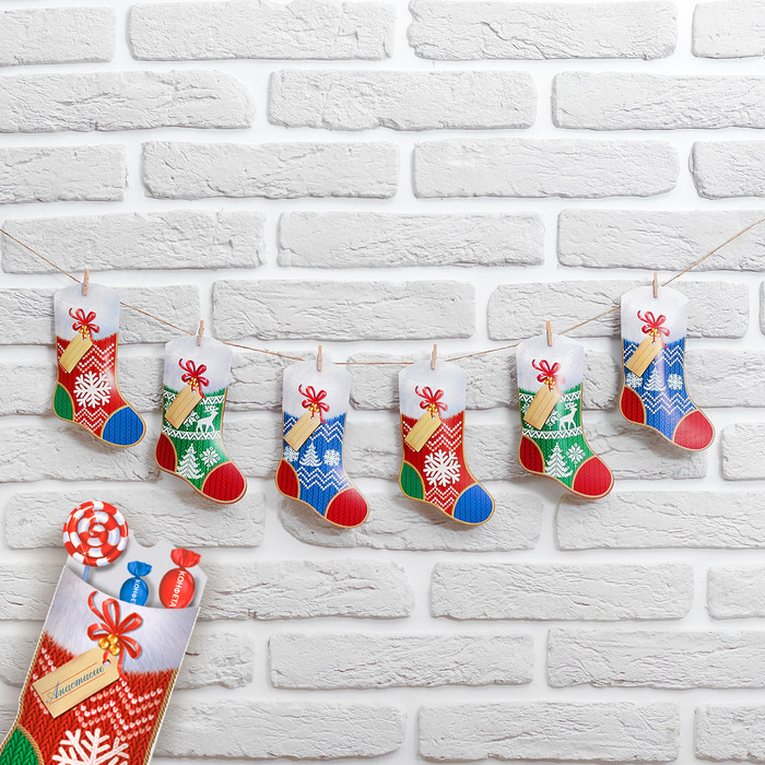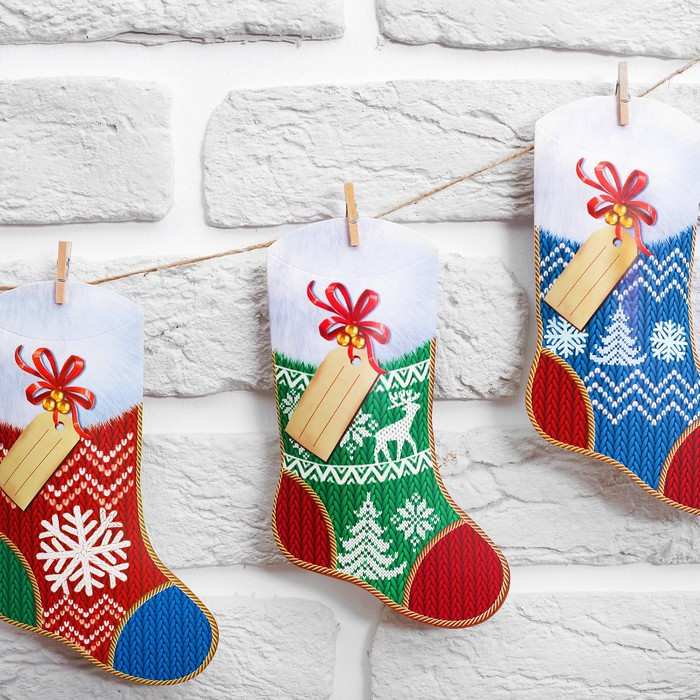 3 пары сапожков, которые можно использовать как гирлянду, как подвески на ёлку в виде упаковки для маленького сюрприза. Например, положив конфету, карамельную трость, маленькую шоколадку. Рекомендую. Купила 2 набора. Кстати, веревочку заменю на шнур d5мм или атласную ленту.