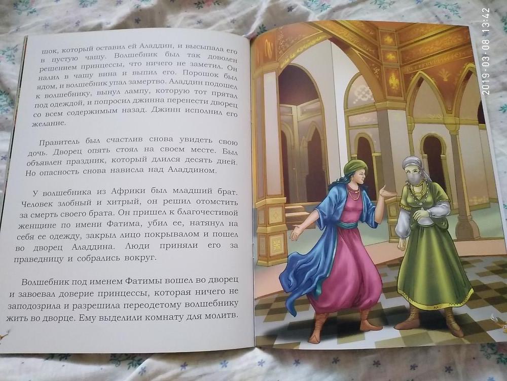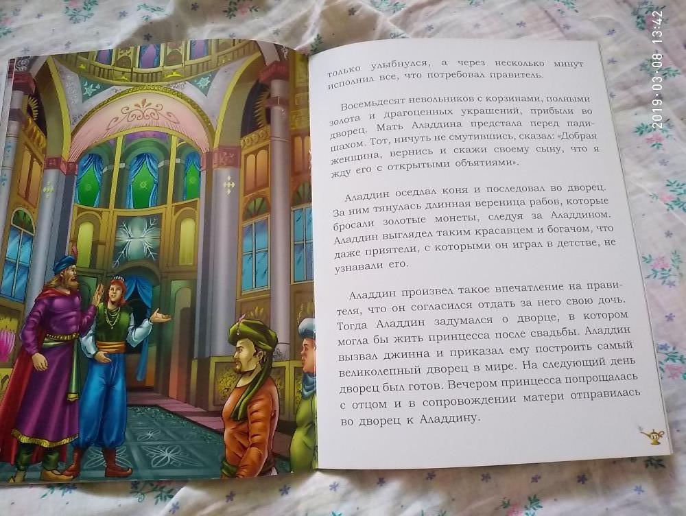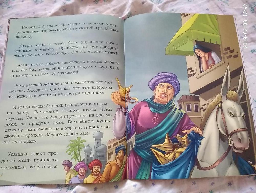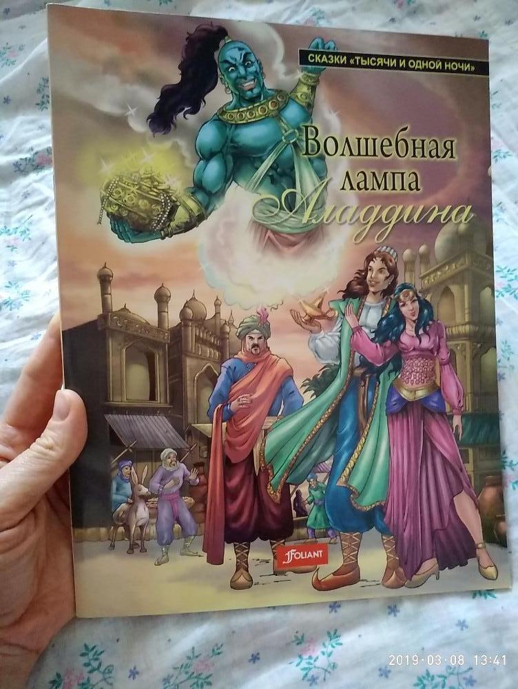 Волшебная лампа Алладина - очень красивая книга, яркие иллюстрации, качественная бумага. Шрифт крупный, читабельный. Приятно даже просто держать в руках. Спасибо, Флип. Книгу шла в подарок по акции, очень рады такому подарку.