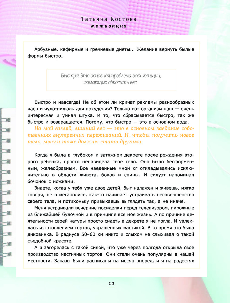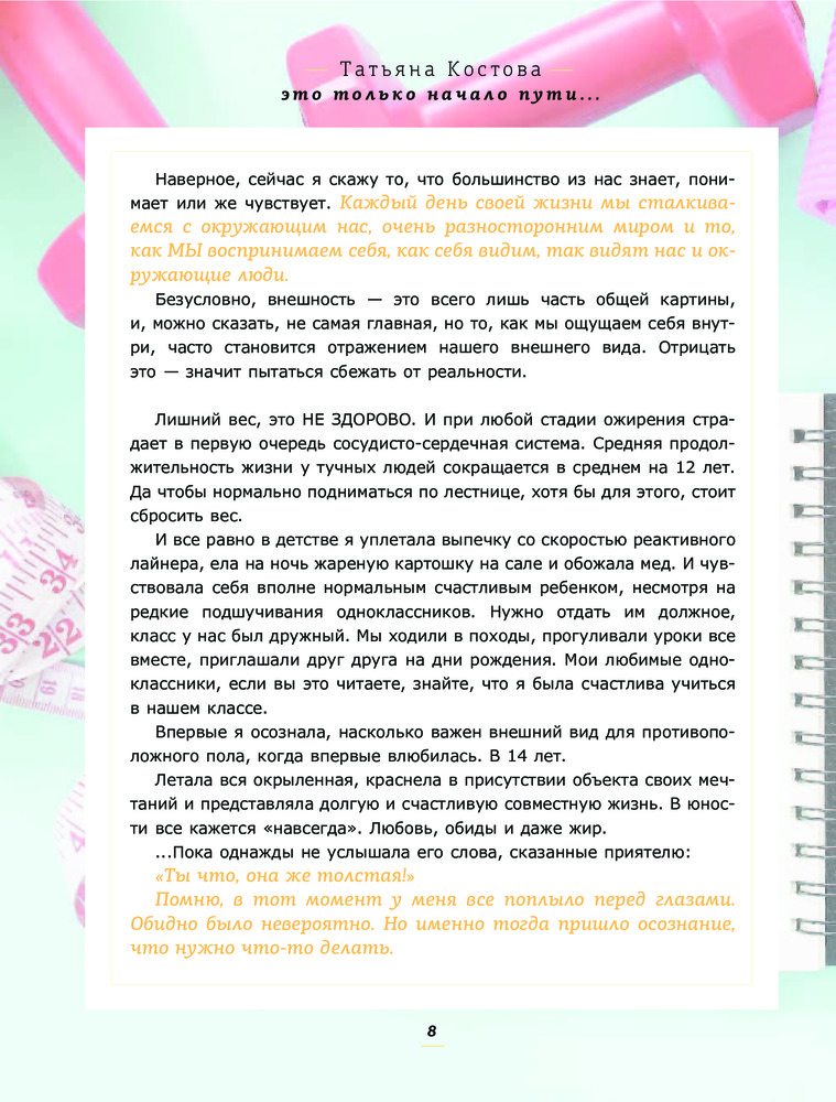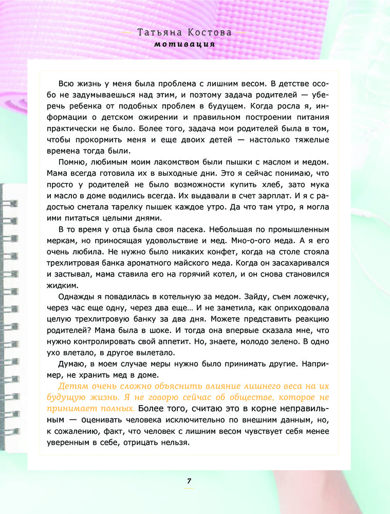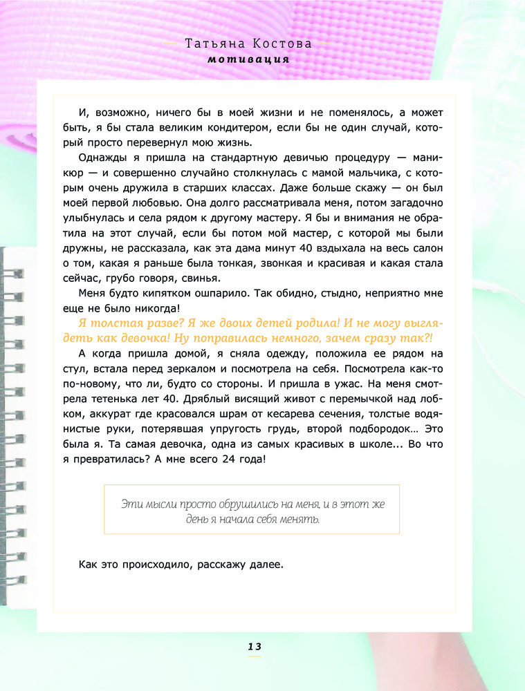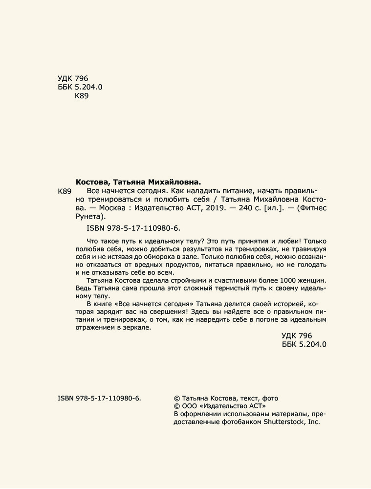 💳 Оплатить за товар можно при получении 🇰🇿 Есть бесплатная доставка по Казахстану от 1 дня 🎁 Копите бонусы с каждой покупки Серия: Фитнес Рунета Что такое путь к идеальному телу? Это путь принятия и любви! Только полюбив себя, можно добиться результатов на тренировках, не травмируя себя и не истязая до обморока в зале. Только полюбив себя, можно осознано оказаться от вредных продуктов, питаться правильно, но не голодать и не отказывать себе во всем. Татьяна Костова сделала стройными и счастливыми более 1000 женщин. Ведь Татьяна сама прошла этот сложный тернистый путь к своему идеальному телу. В книге «Все начинается сегодня» Татьяна делится своей историей, которая зарядит вас на свершения! Здесь вы найдете все о правильном питании и тренировках, о том, как не навредить себе в погоне за идеальным отражением в зеркале. |