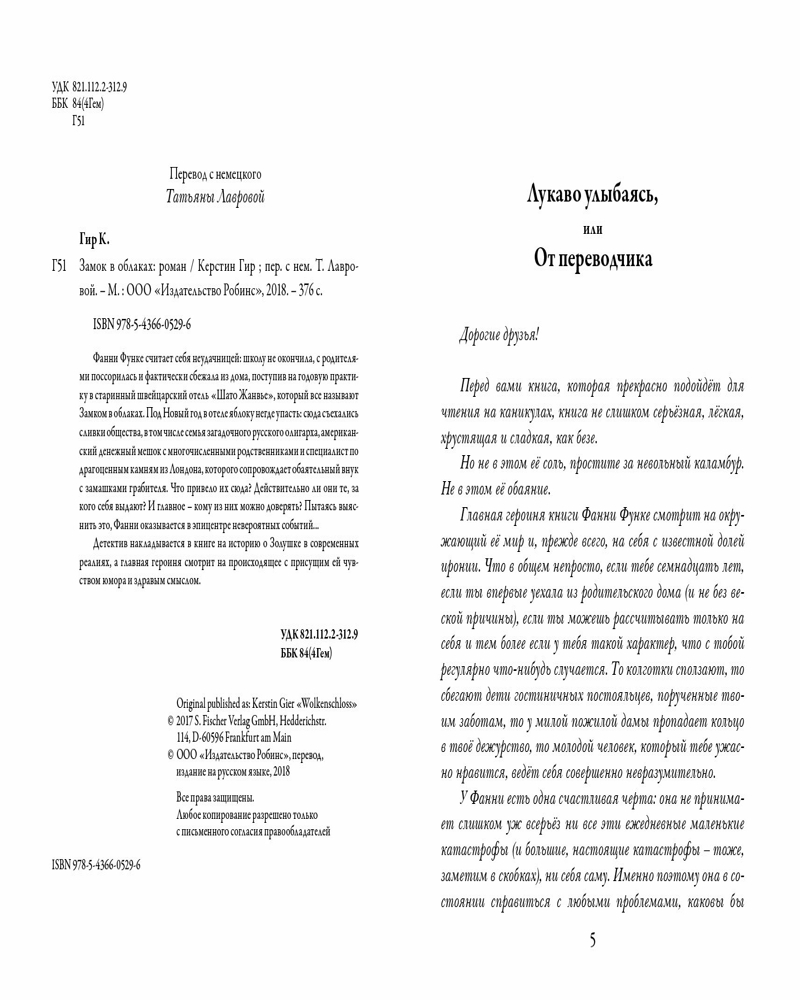 ЗАМОК В ОБЛАКАХ☁️🏰☁️ Очень хочется в отпуск, но на счету ни гроша или закрыты границы? Не беда! У меня для вас отличное решение - бесплатный отпуск в Швейцарии в отеле с миллионерами! Спросите меня: "Как?" Легко и просто! Открываем книгу Керстен Гир "Замок в облаках" и наслаждаемся рождественским праздничным настроением вдали от дома. Эта книга для меня как яблочный пирог с корицей, а рецепт его очень прост: щепотку лёгкого юмора от автора, добавляем интересных и разносторонних персонажей, все это смешиваем с зимней атмосферой старинного уютного отеля в швейцарской глубинке. И таким образом, получаем историю о Фанни Функе из Бремена под Ахимом, девушке, которая ну очень любит попадать в различные истории! Хочется ещё раз повторить, что это идеальная книга для отдыха! Мне очень понравилось, как умело Керстен Гир сочетает лёгкий юмор, сладкие вздохи о первой любви и детективный сюжет с неожиданным поворотом. Обещаю, что вы точно не соскучитесь! А ещё она идеальна для зимы! Вы только представьте: горы белейшего снега, старинные сани с двумя красивыми жеребцами в упряжке, альпийская идиллия и компания из семи галок, атмосферный отель с башенками, каминами, большой библиотекой, потайными ходами, собственным призраком и даже Запретной кошкой (чем вам не Хогвартс?), а ещё дружелюбный персонал и повара, которые так и норовят угостить вас ароматной и вкусной выпечкой... Мне продолжать или вы уже побежали её читать?) Надеюсь, я смогла вас замотивировать! Настоятельно рекомендую надеть рождественские носочки, налить травяной чай или горячий шоколад, запастись свежеиспечённой ароматной выпечкой и укутаться в теплый и мягкий плед! И с этой лёгкой книгой вы уж точно сможете немного отдохнуть!