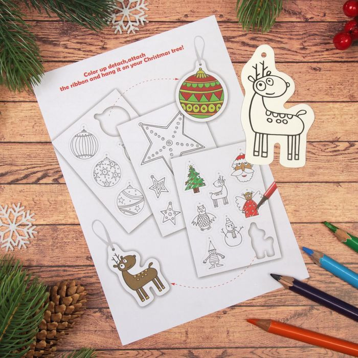 Доча (почти 3 года) с восторгом раскрасила ёлочные игрушки и украсила ими ёлку. В комплекте 3 листа с различной тематикой, в комплекте есть верёвочки. Очень понравилась задумка!