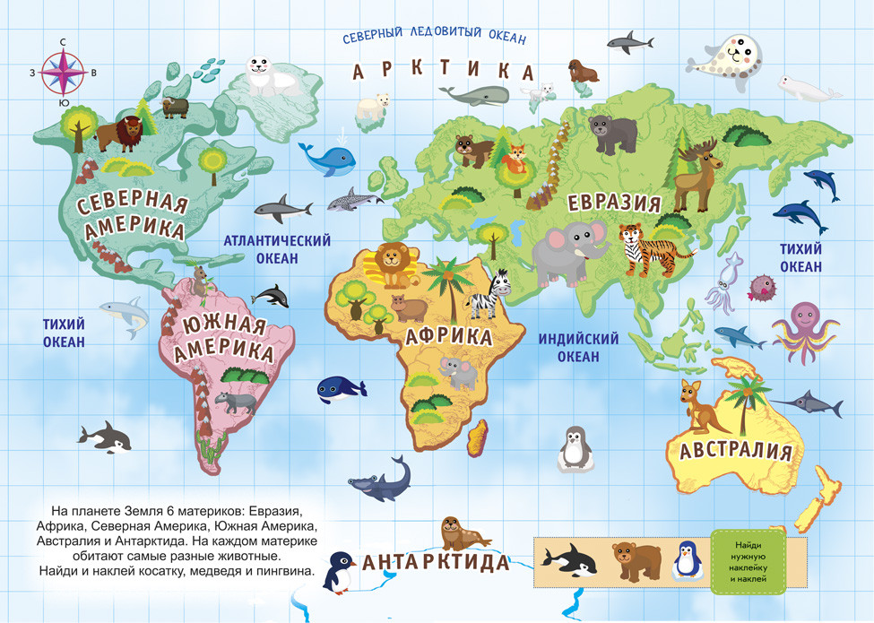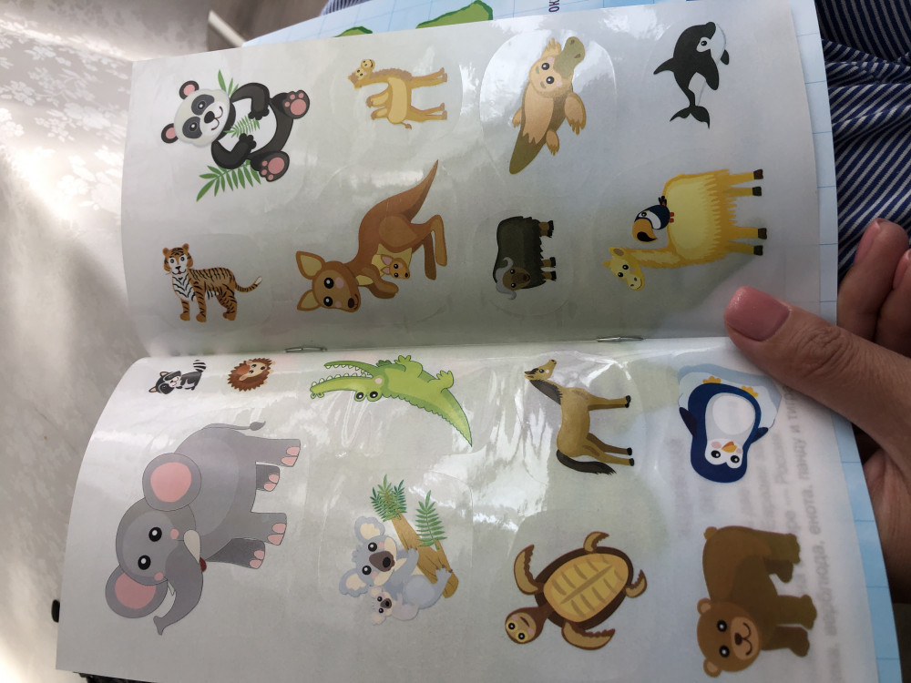 Яркий, красочный атлас. Все картинки прорисованы хорошо, наклеек не много, но они крупные. Единственный минус, это переплёт. У некоторых животных отсутствует название. А так нам очень понравился атлас. Рекомендуем