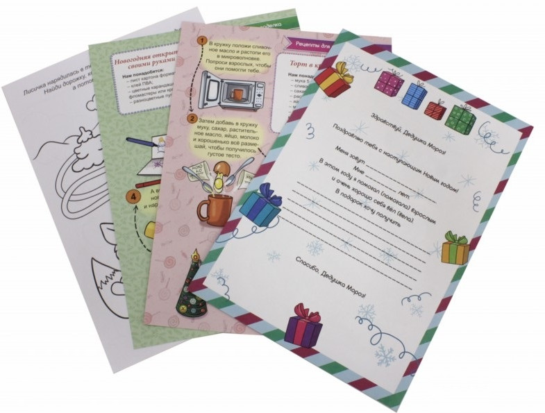 💳 Оплатить за товар можно при получении 🇰🇿 Есть бесплатная доставка по Казахстану от 1 дня 🎁 Копите бонусы с каждой покупки Внутри этого волшебного конверта малыш найдёт всё необходимое для подготовки к празднику. Его ждут весёлые раскраски с заданиями, рецепты, поделки и бланк для письма Деду Морозу! |