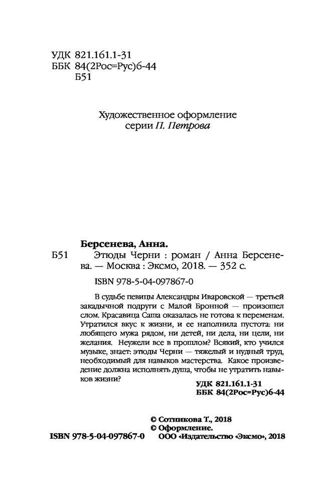 Этюды ЧерниВ данный момент этот товар отсутствует в продаже. Возможно, у нас найдется аналогичный или похожий товар здесь. Серия: Анна Берсенева. Изящная словесность (обл) В судьбе певицы Александры Иваровской — третьей закадычной подруги с Малой Бронной — произошел слом. Красавица Саша оказалась не готова к переменам. Утратился вкус к жизни, и ее наполнила пустота: ни любящего мужа рядом, ни детей, ни дела, ни цели, ни желания. Неужели все в прошлом? Всякий, кто учился музыке, знает: этюды Черни — тяжелый и нудный труд, необходимый для навыков мастерства. Какое произведение должна исполнять душа, чтобы не утратить навыков жизни? |