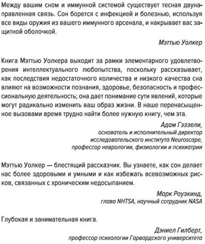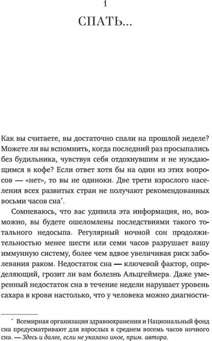 Классная книга, всем советую к прочтению. Изменила отношение ко сну, теперь уже 3 месяца сплю нормально, чувствую отлично