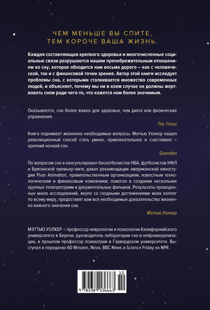 Внешнее исполнение на высоте листы, качество бумаги, обложка, оформление. ( Любители книг оценят ) Нет ничего прекраснее держать в руках книгу и чувствовать запах книги, переворачивая страницы. О книге: Книга очень интересная больше научная, но лёгкая в понимании. Мы часто уделяем внимание правильному питанию, спорту, своему здоровью и т.д. Но редко думаем о сне, о качестве сна. Автор изучал влияние сна более 60 лет на млекопитающих и людях до 86 лет. Результаты удивляют. Сказать, что ее обязан прочитать каждый ? Ну не скажу. Но ознакомится с книгой или отрывками из статьи нужно.