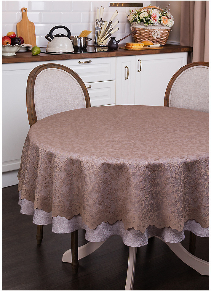 Скатерть выполнена из полиэстера — текстильного материала нового поколения. Он очень прочен и мягок, хорошо держит форму при нагревании, мало мнется, не поражается молью. Благодаря своим жиро- и водоотталкивающим свойствам полиэстер — идеальный материал для скатерти.