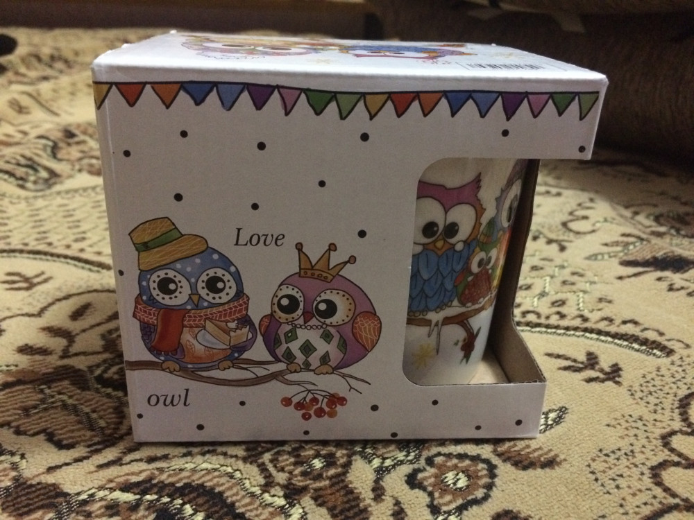 Фарфор-желтоватого оттенка, не белый. Семейка совят на кружке-очень позитивно влияет на настроение! Оставила себе, буду пользоваться.