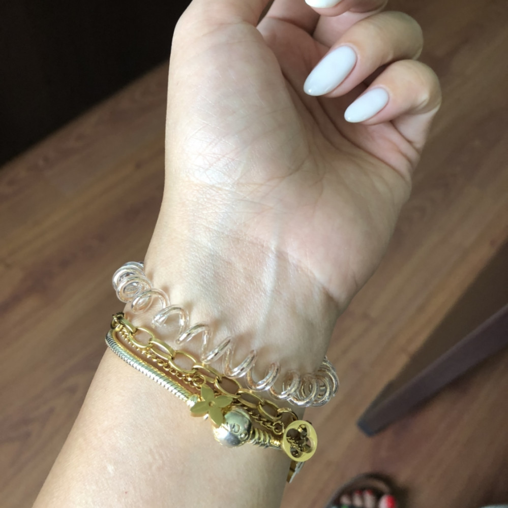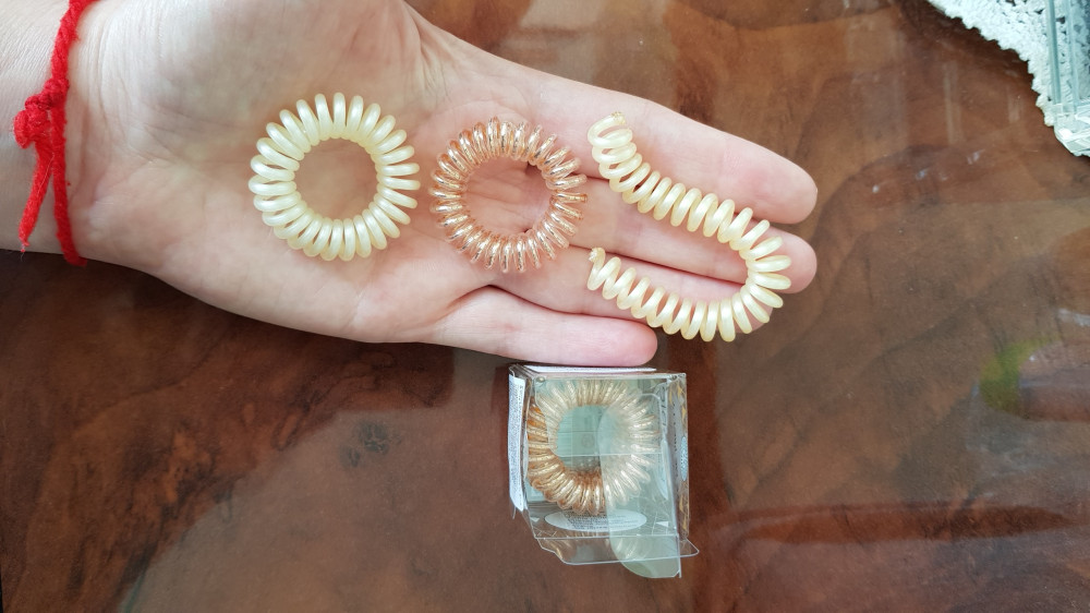 Прикольные резинки, как браслет, мне давит на руку. Волосы тонкие, шишку держит на Ура, можно и спортом заниматься, и прыгать, не падает.