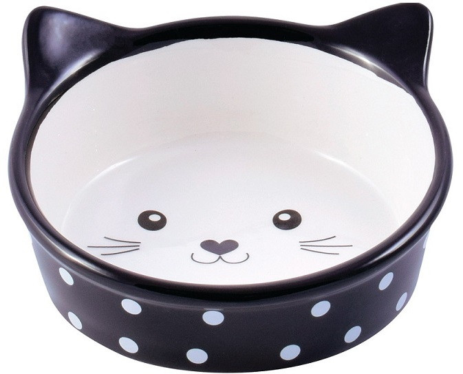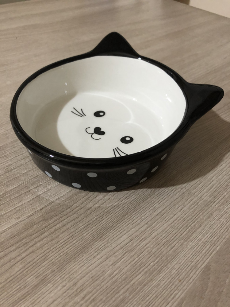 Очень милая керамическая миска, советую выбирать именно керамику, тк пластмасса и металл окисляют и вредно воздействуют на еду при длительном контакте (например вода должна быть всегда в миске). Не очень глубокий объем, но у нас котёнок, ему в самый раз. Не скользит, качественная миска.