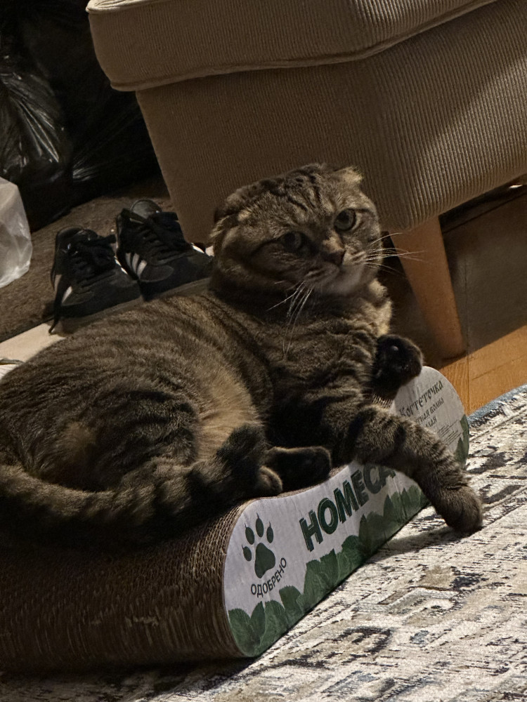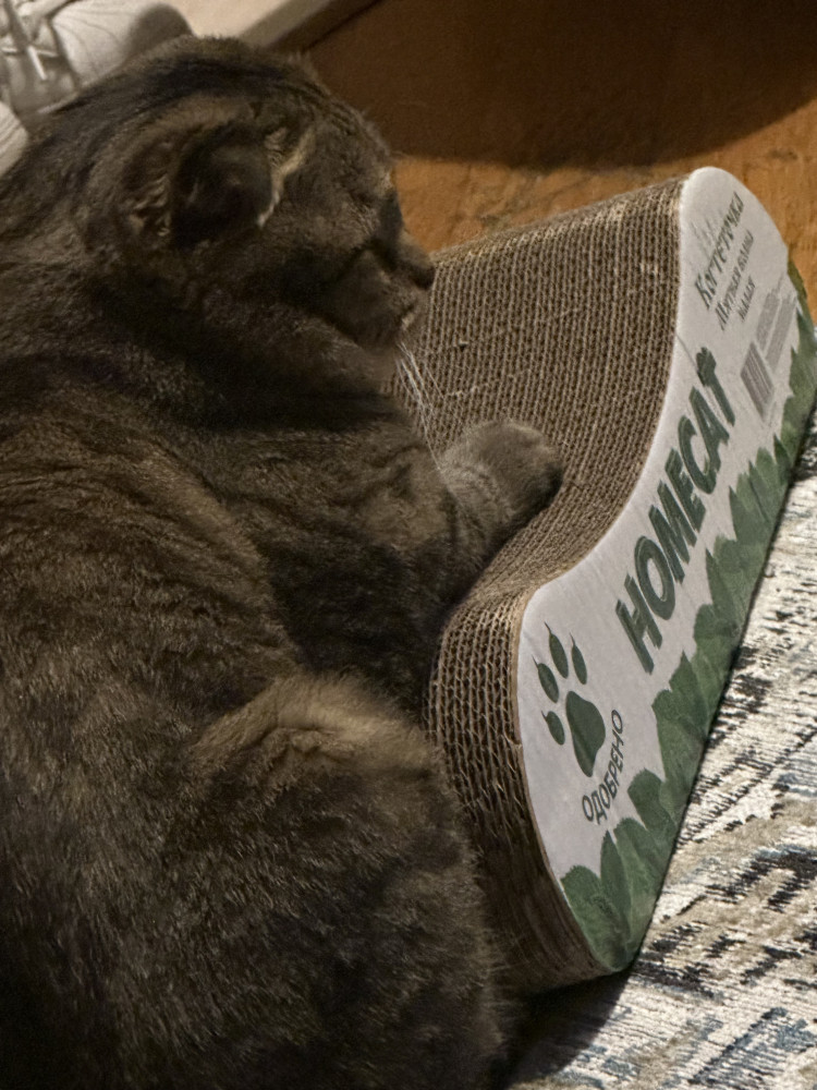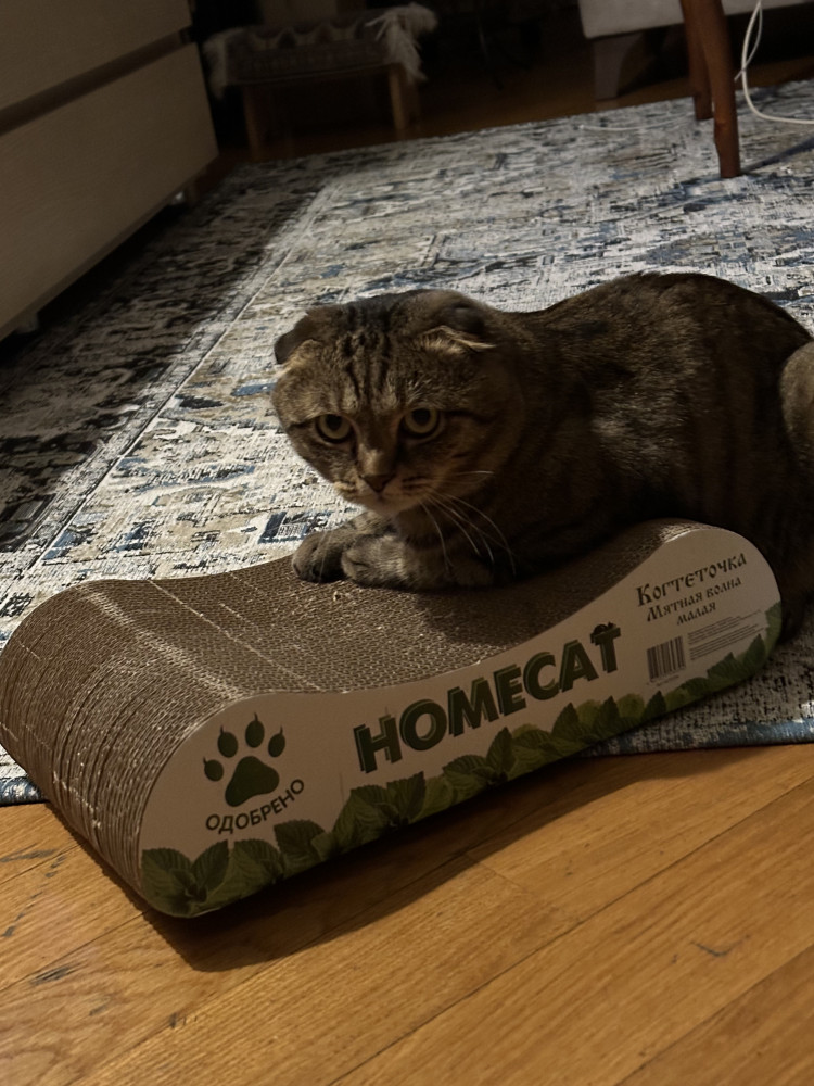 Вообще неудобная, моему не понравилась. Более того, он на нее пошел и написал. С обычной не волнистой картонной когтеточкой такого не было.