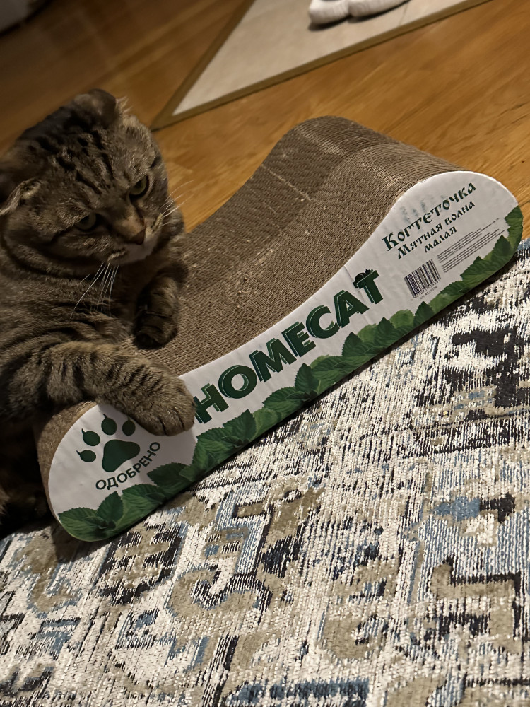 Отличное качество, картон плотнее чем на других когтеточках. Мята почему то совсем не пахнет, поэтому кошку не особо заинтересовало. Думаю со временем обратит внимание.