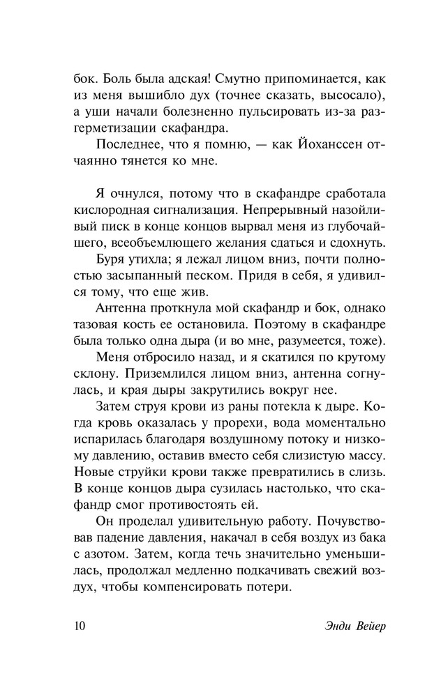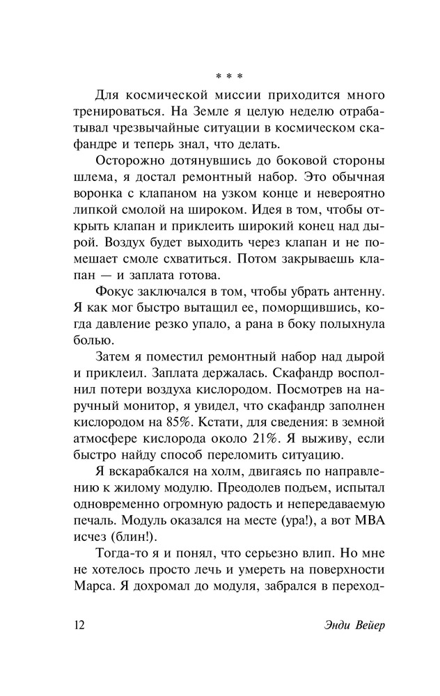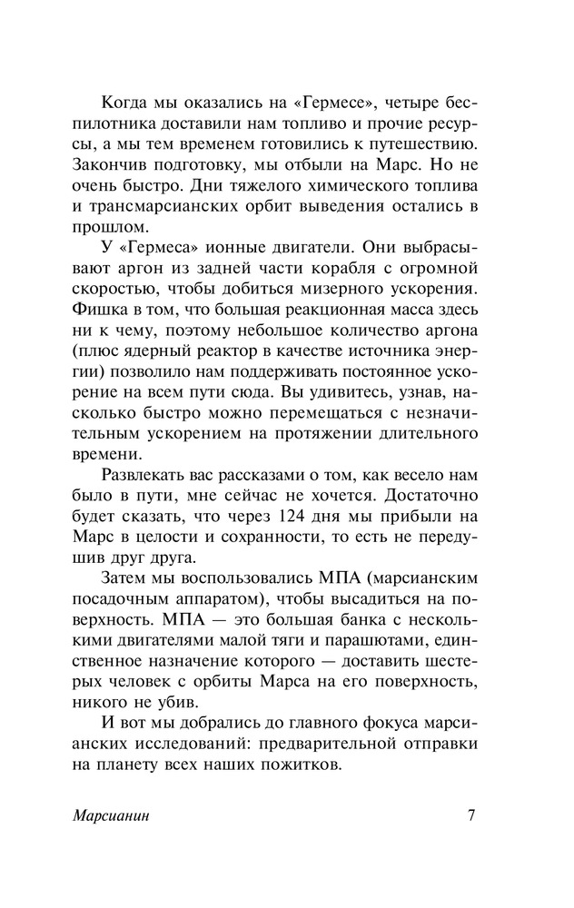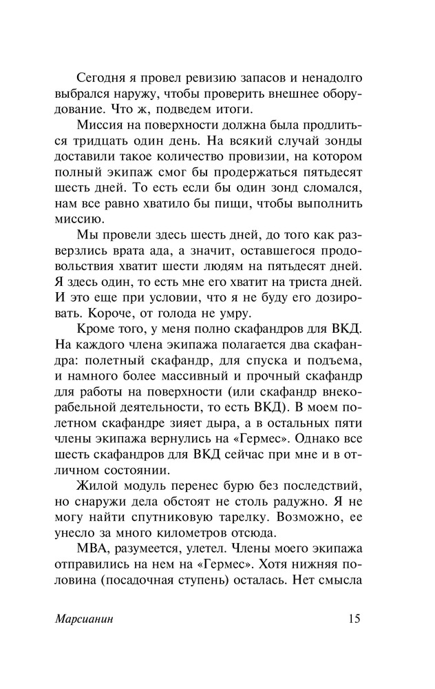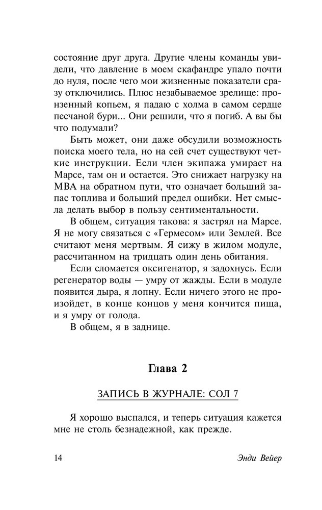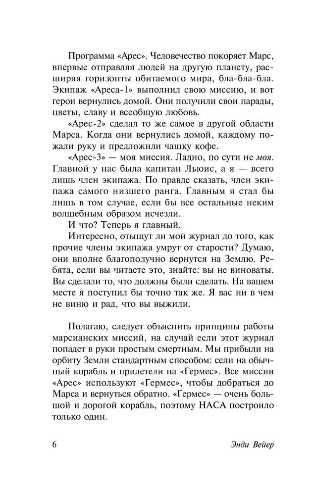 Отличная книга. Как было отмечено в одном из комментариев, как Робинзон Крузо, но на Марсе. Оторваться не возможно. Книга держит в постоянном напряжении, но это хорошее напряжение. Рекомендую к прочтению. Спасибо магазину за прекрасную работу и книгу.