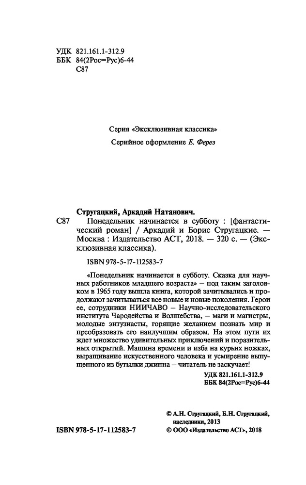 💳 Оплатить за товар можно при получении 🇰🇿 Есть бесплатная доставка по Казахстану от 1 дня 🎁 Копите бонусы с каждой покупки Серия: Эксклюзивная классика (Лучшее) «Понедельник начинается в субботу. Сказка для научных работников младшего возраста» — под таким заголовком в 1965 году вышла книга, которой зачитывались и продолжают зачитываться все новые и новые поколения. Герои ее, сотрудники НИИЧАВО, — Научно-исследовательского института Чародейства и Волшебства, — маги и магистры, молодые энтузиасты, горящие желанием познать мир и преобразовать его наилучшим образом. На этом пути их ждет множество удивительных приключений и поразительных открытий. Машина времени и изба на курьих ножках, выращивание искусственного человека и усмирение выпущенного из бутылки джинна — читатель не заскучает! |