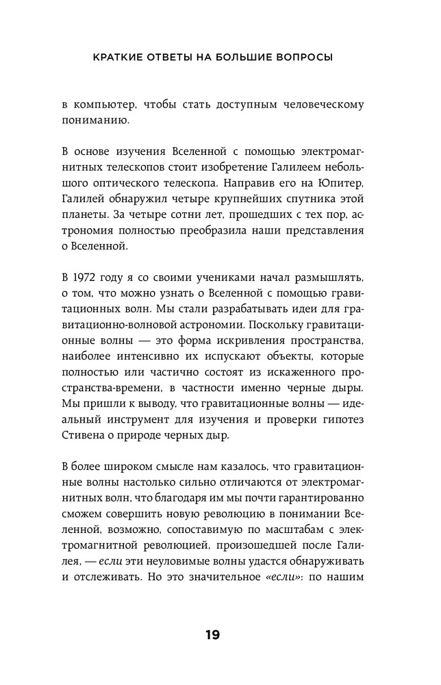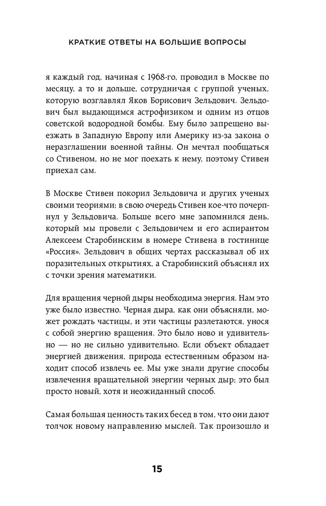 Книга очень интересная с точки зрения обычного жителя этой планеты. Как мне показалось, здесь подняты глобальные вопросы нашего существования, как мы сами уничтожаем то, где живём. Где-то книга заставила задуматься, где-то показалось, что то, что написал Хокинг это мысли безумного учёного, но это дело каждого: верить или нет. Но лично для меня интересно и полезно было узнать мнение учёного на то, как относится к религии (у них всегда свой другой подход: никто из них никогда не отрицает существования, но и не оправдывает) если любите научпоп и очень интересно узнать ответы на данные вопросы, то я думаю, что не стоит жалеть и времени и денег на неё. Очень классная книга!