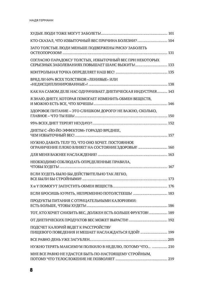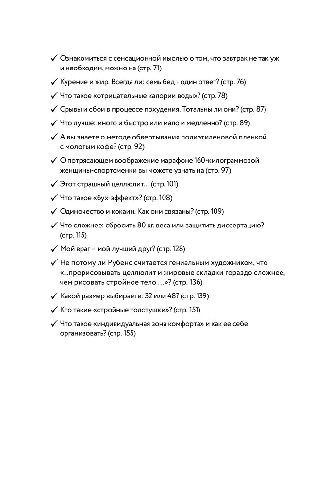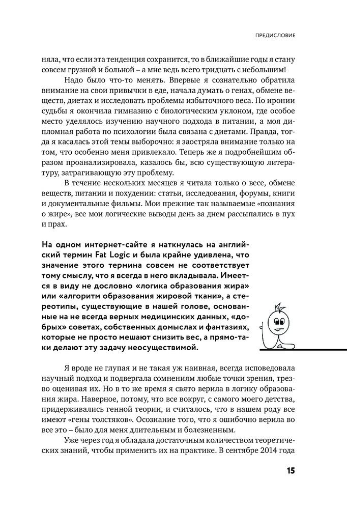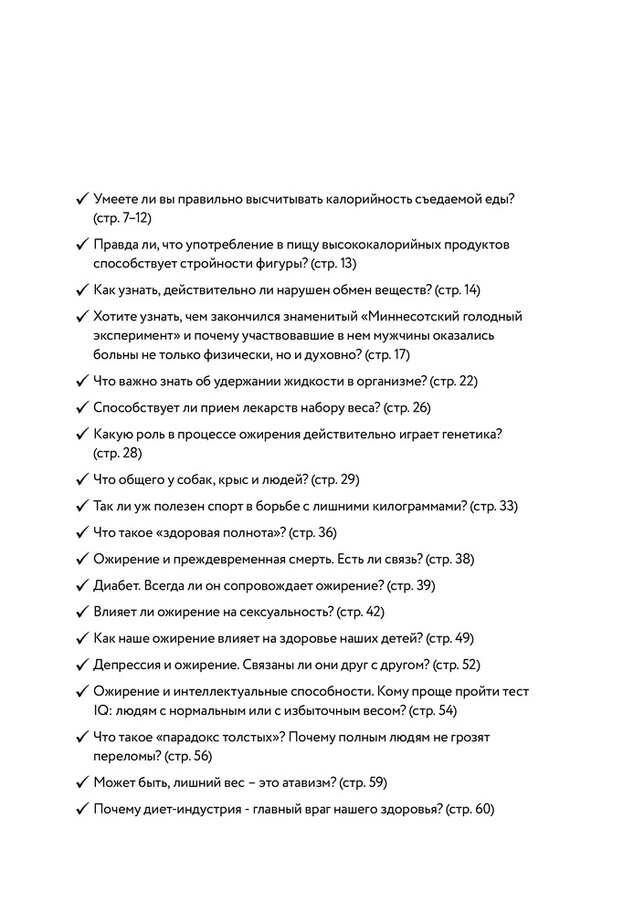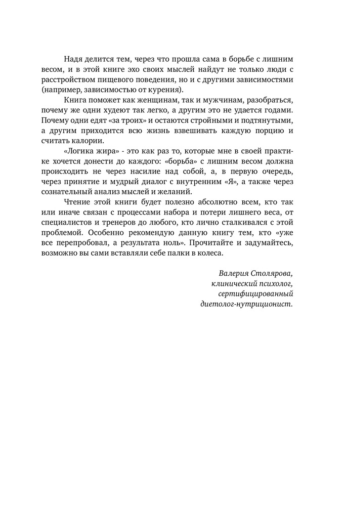 Книга очень полезная, советы научно доказаны и работают (проверено на себе)! В интернете очень много «воды» на тему похудения и питания, а эта книга очень структурно объясняет почему мы не худеем или не толстеем, про стереотипы, которые мешают нам похудеть и многое другое.