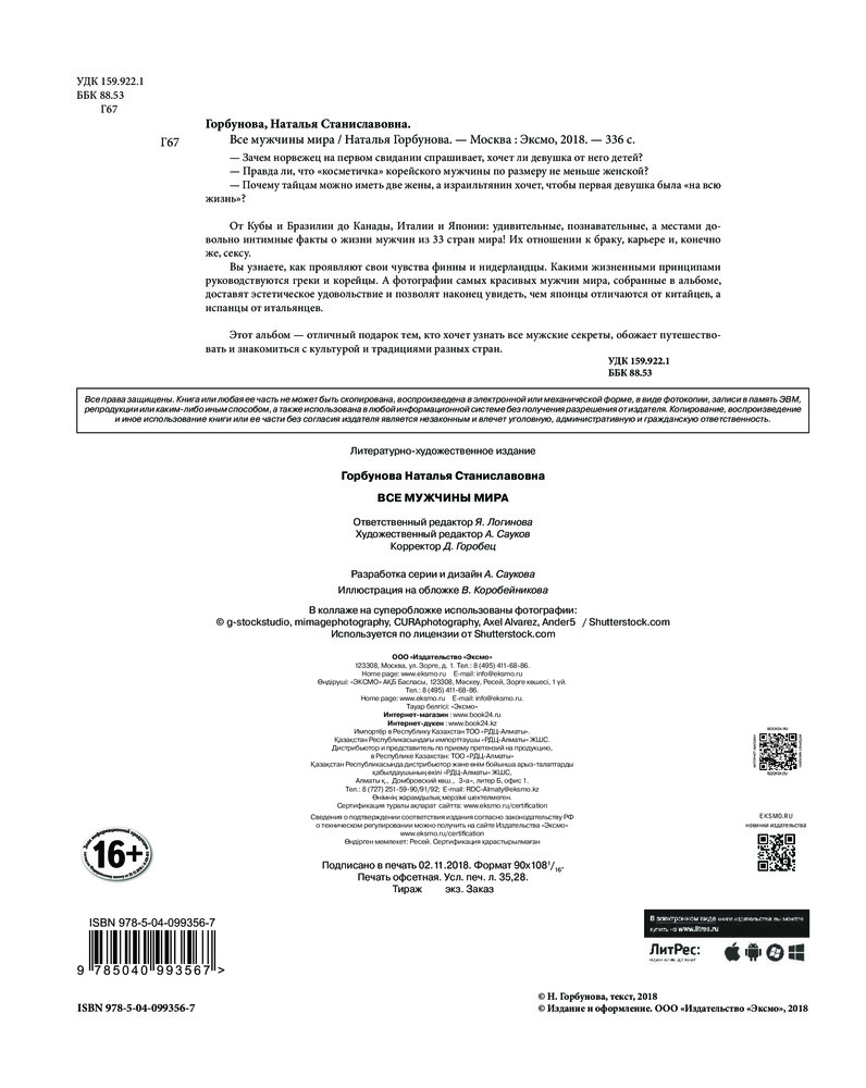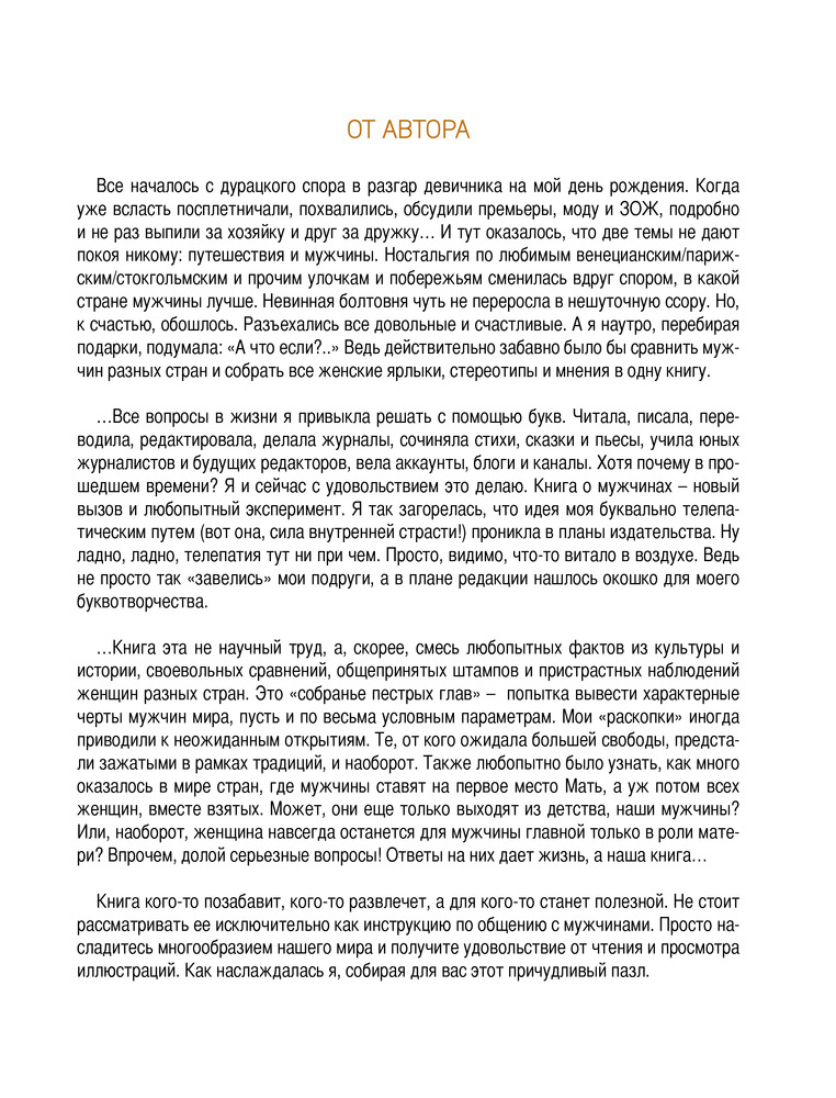 Все мужчины мираВ данный момент этот товар отсутствует в продаже. Возможно, у нас найдется аналогичный или похожий товар здесь. Серия: Альбом-подарок. Откровенный путеводитель по странам мира — Зачем норвежцы на первом свидании спрашивают, хочет ли девушка от него детей? — Правда ли, что «косметичка» корейского мужчины по размеру не меньше женской? — Почему тайцам можно иметь две жены, а израильтянин хочет, чтобы первая девушка была «на всю жизнь»? От Кубы и Бразилии до Канады, Италии и Японии: удивительные, познавательные, а местами довольно интимные факты о жизни мужчин из 33 стран мира! Их отношении к браку, карьере и, конечно же, сексу.Вы узнаете, как проявляют свои чувства финны и нидерландцы. Какими жизненными принципами руководствуются греки и корейцы. А фотографии самых красивых мужчин мира, собранные в альбоме, доставят эстетическое удовольствие и позволят, наконец, увидеть, чем японцы отличаются от китайцев, а испанцы от итальянцев. Этот альбом — отличный подарок тем, кто хочет узнать все мужские секреты, обожает путешествовать и знакомиться с культурой и традициями разных стран. |
