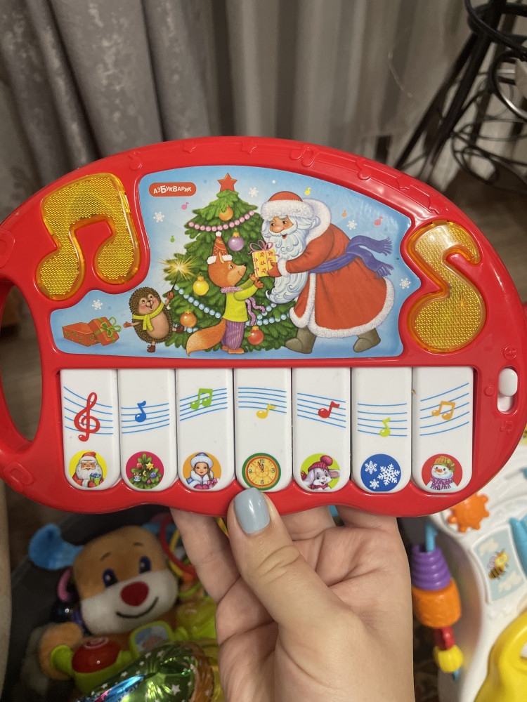 Пианино идет в комплекте с батарейками, хорошие новогодние песенки, ребенок не выпускает из рук, стучит по клавишам