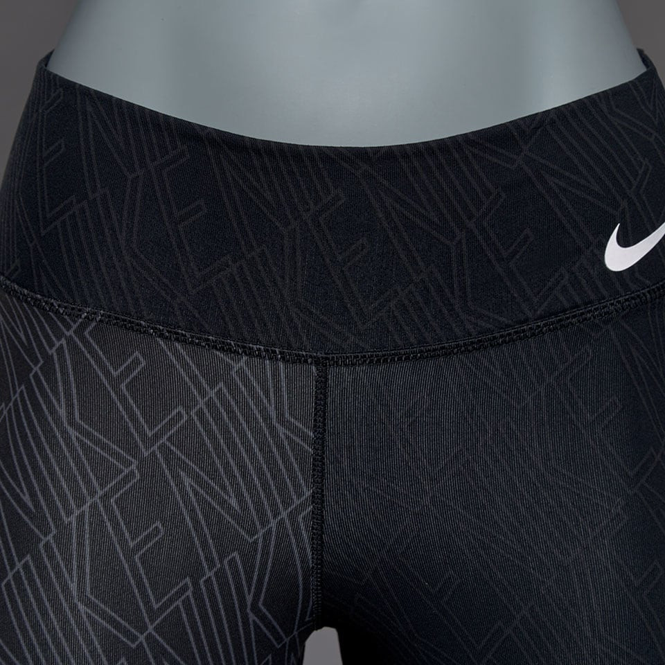 Тайтсы изготовлены из высокотехнологичного стрейчевого материала Nike Power Dri-FIT, отводящего испарину от поверхности тела и сохраняющего кожу сухой во время интенсивных тренировок. Имеют узкий крой и обладают подтягивающим эффектом, стройнят и визуально улучшают фигуру. Пояс сзади имеет анатомический крой, что способствует удобной посадке при наклонах и приседаниях. Внутренняя треугольная ластовица обеспечивает комфорт при разнонаправленном диапазоне движений. Плоские качественные швы способствуют снижению трения и, как следствие, препятствуют натиранию кожи. Графический принт в виде логотипа NIKE по всей поверхности модели. Лого Nike Swoosh на левом бедре.
