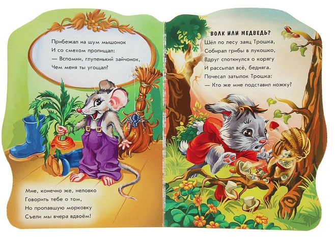 Книжка "с глазками" . Очень твёрдый переплёт, необычная форма самой книжки. Большие красочные красивые картинки, очень интересный для деток текст стишков. Книжка без недостатков, просто СУПЕР!