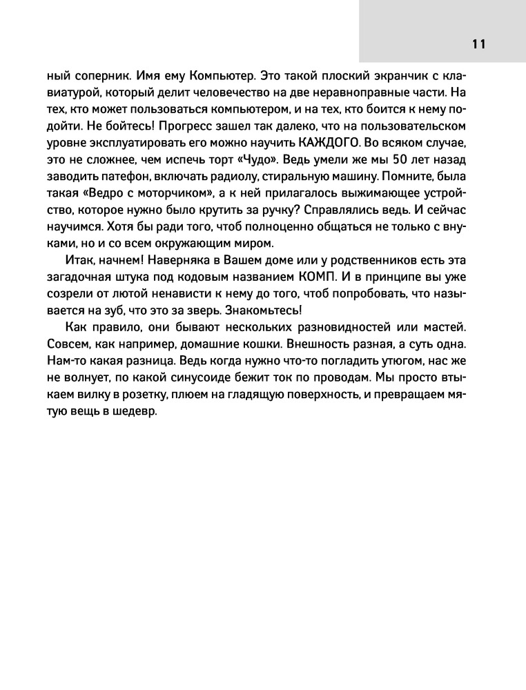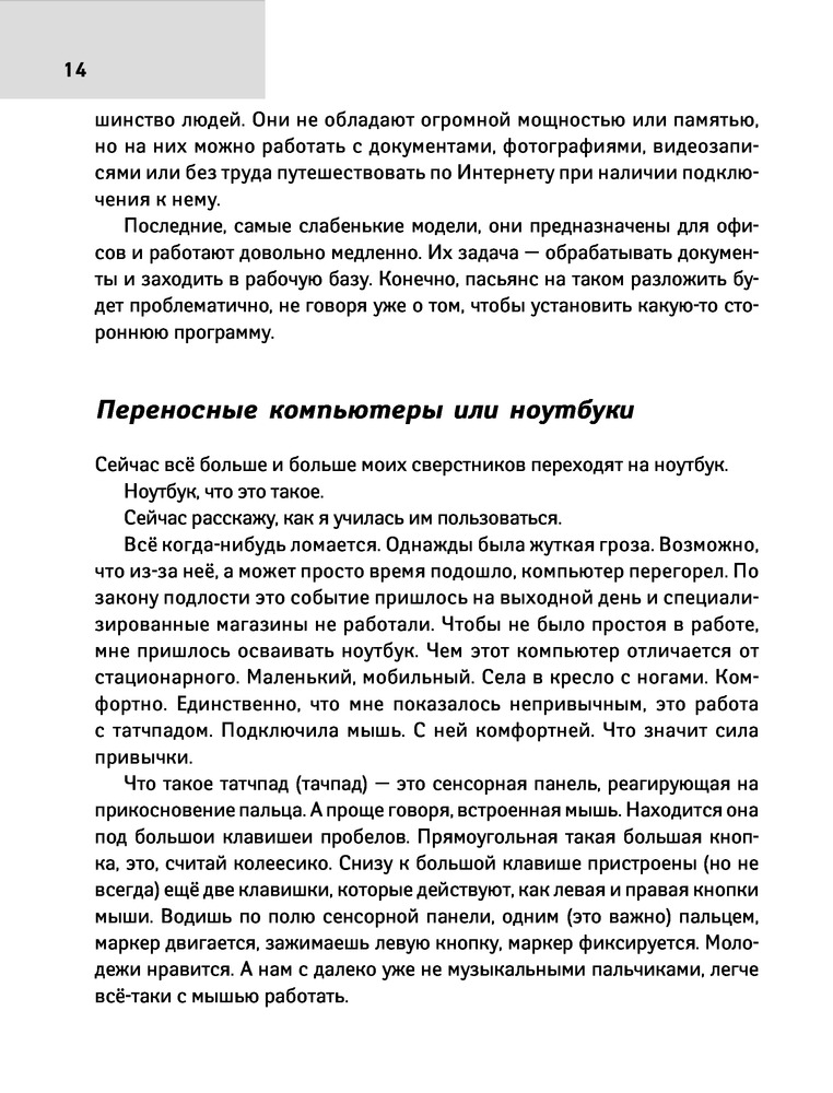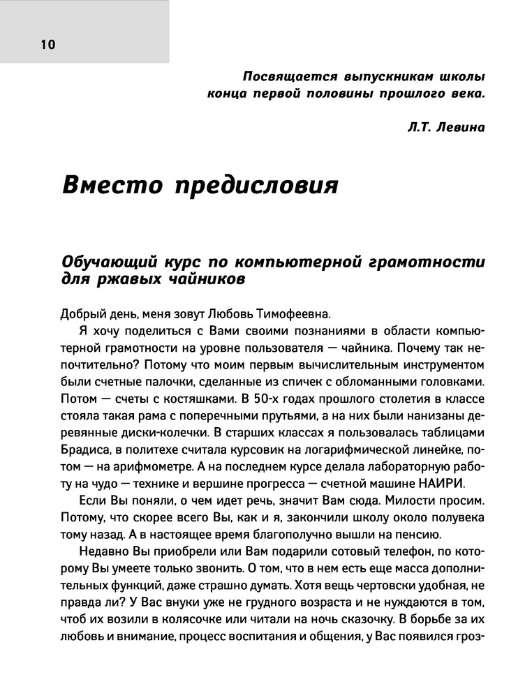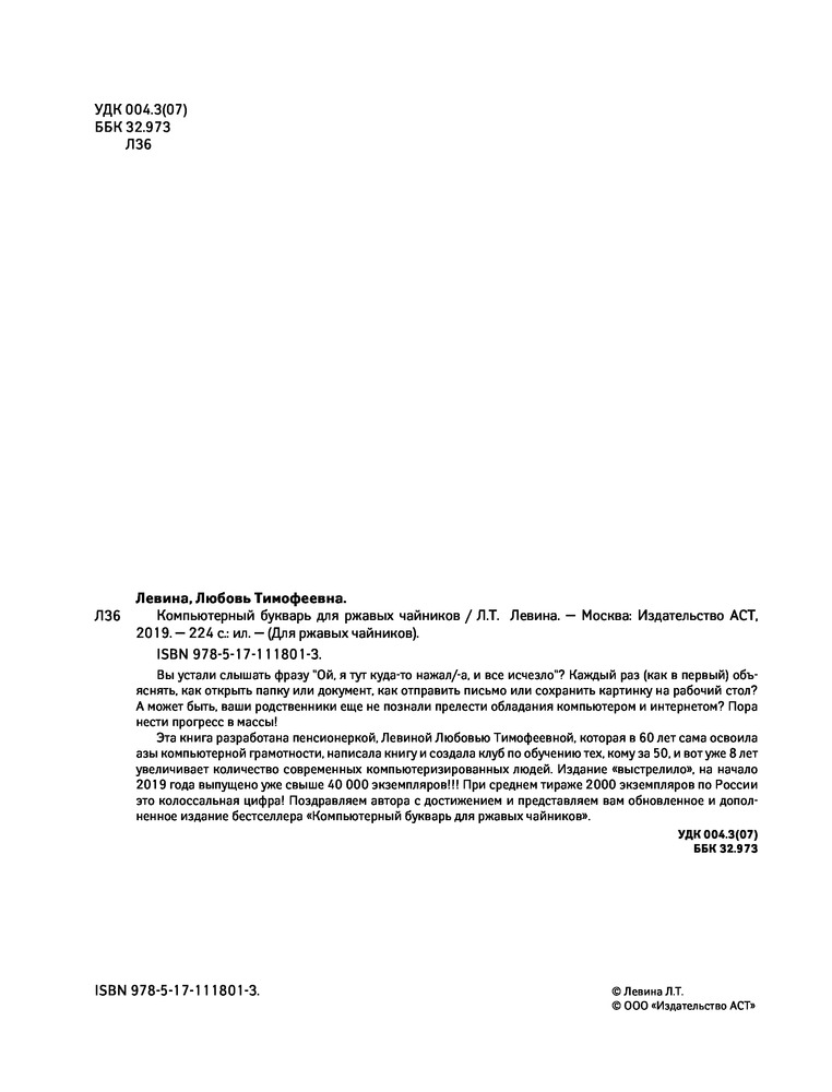 Компьютерный букварь для ржавых чайниковВ данный момент этот товар отсутствует в продаже. Возможно, у нас найдется аналогичный или похожий товар здесь. Серия: Для ржавых чайников Вы устали слышать фразу «Ой, я тут куда-то нажал/-а и все исчезло»? Каждый раз (как в первый) объяснять, как открыть папку или документ, как отправить письмо или сохранить картинку на рабочий стол? А может быть, ваши родственники еще не познали прелести обладания компьютером и интернетом? Пора нести прогресс в массы! Эта книга разработана пенсионеркой, Левиной Любовью Тимофеевной, которая в 60 лет сама освоила азы компьютерной грамотности, написала книгу и создала клуб по обучению тех, кому за 50, и вот уже 8 лет увеличивает количество современных компьютеризированных людей. Издание «выстрелило», на начало 2019 года выпущено уже свыше 40 000 экземпляров!!! При среднем тираже 2000 экземпляров по России это колоссальная цифра! Поздравляем автора с достижением и представляем вам обновленное и дополненное издание бестселлера «Компьютерный букварь для ржавых чайников». |