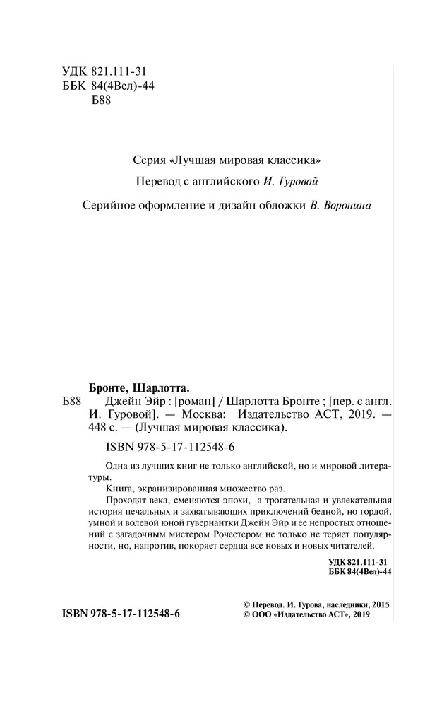 💳 Оплатить за товар можно при получении 🇰🇿 Есть бесплатная доставка по Казахстану от 1 дня 🎁 Копите бонусы с каждой покупки Серия: Лучшая мировая классика Одна из лучших книг не только английской, но и мировой литературы. Книга, экранизированная множество раз. Проходят века, сменяются эпохи, — а трогательная и увлекательная история печальных и захватывающих приключений бедной, но гордой, умной и волевой юной гувернантки Джейн Эйр и ее непростых отношений с загадочным мистером Рочестером не только не теряет популярности, но, напротив, покоряет сердца все новых и новых читателей. |