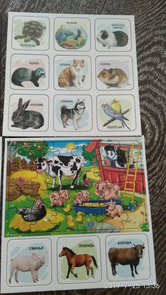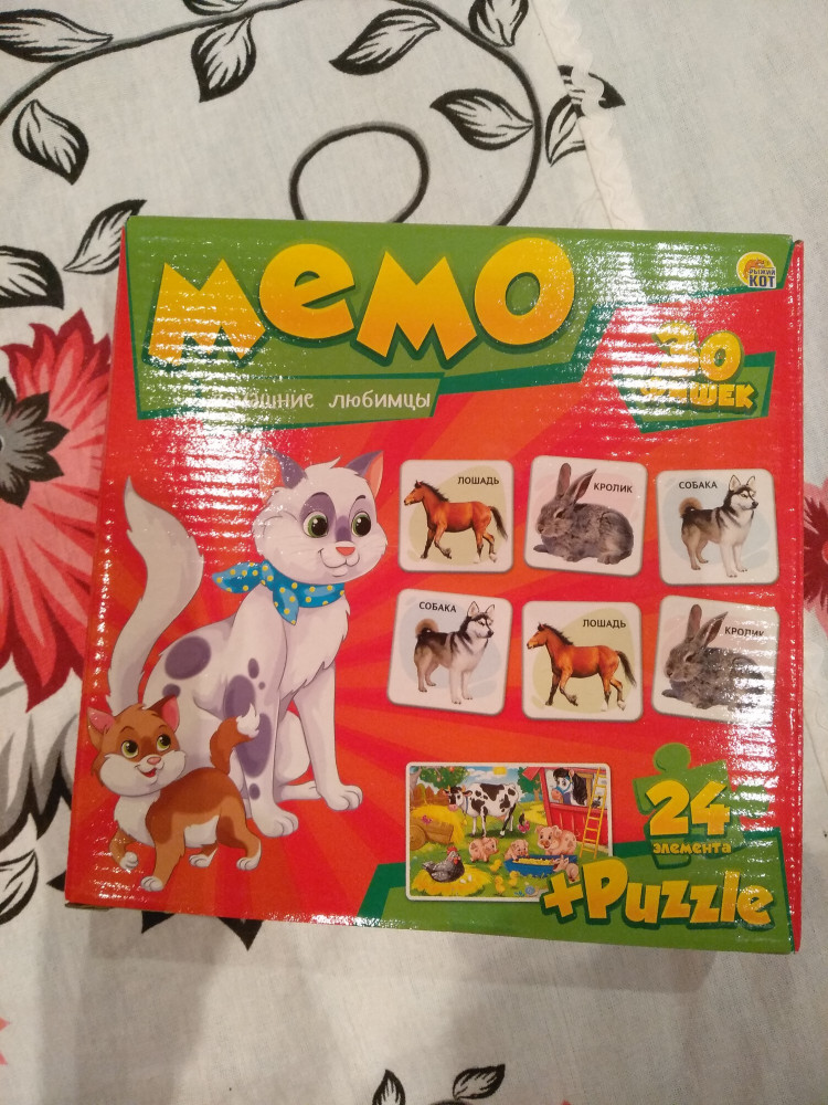 Картон не очень плотный, но сами карточки крупные, размер 4,5*4,5 см. Рисунки красивые. Пазлы очень мелкие, общий размер 10*15 см. Моей дочери 2.8 и она любит пазлы, и эту игру купила ещё из-за пазлов. Но они мелкие и пока не интересны. Так что игра пока полежит на полке. Коробка красивая, но неудобно, что она открывается только сверху, а не традиционно, отдельно коробочка, а отдельно крышка. Так было бы удобнее.