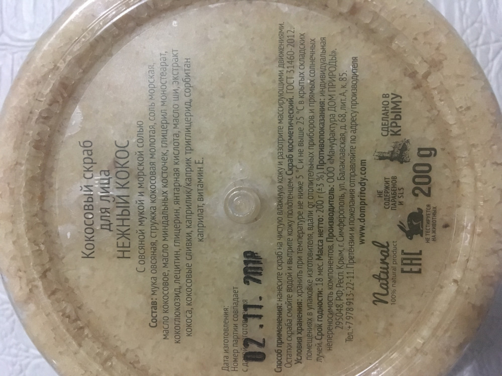 Скраб суховатый и очень маслянистый, наносить немного проблематично, нужно приноровиться. Вкусно пахнет кокосом, скрабит деликатно. Баночка 200г. ооочень плотно набита, хватит надолго👍🏻.
