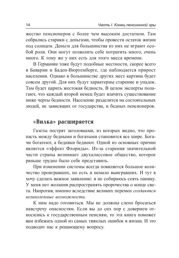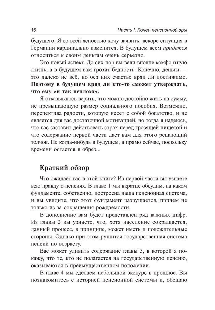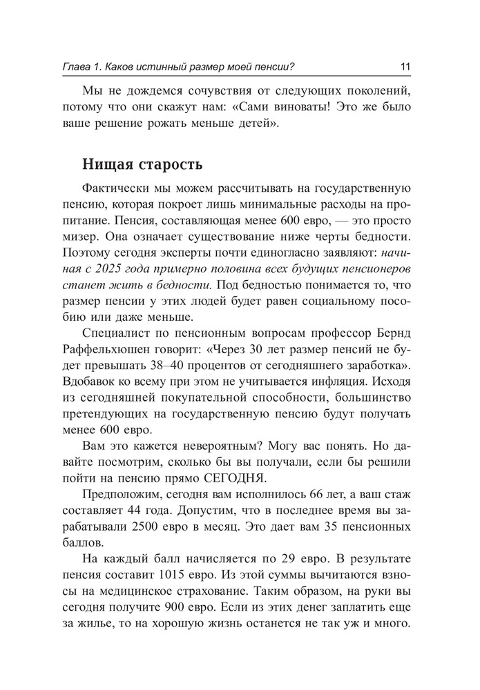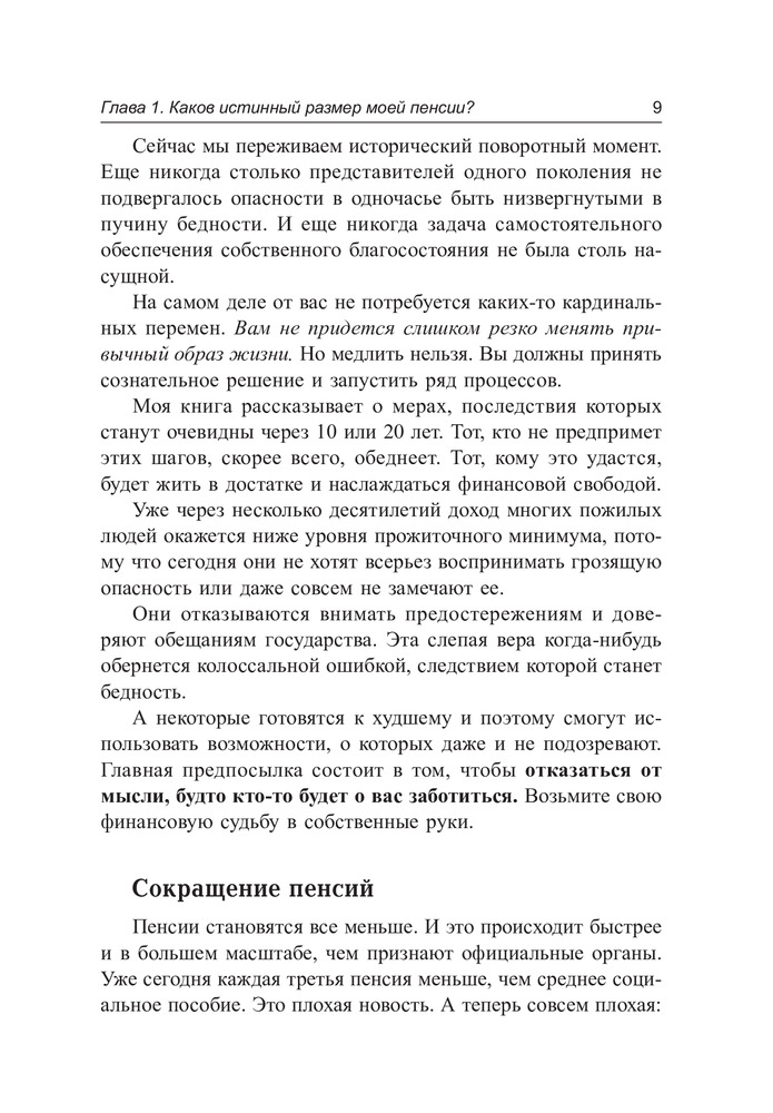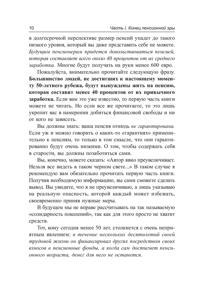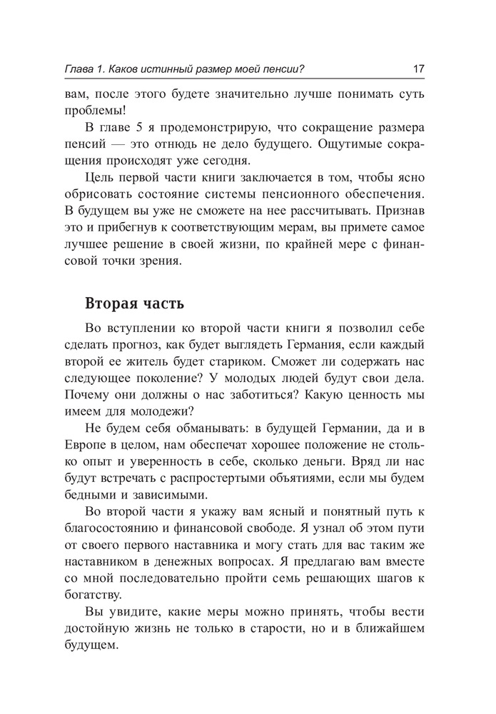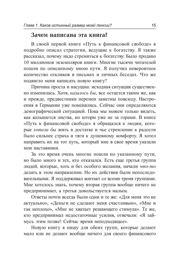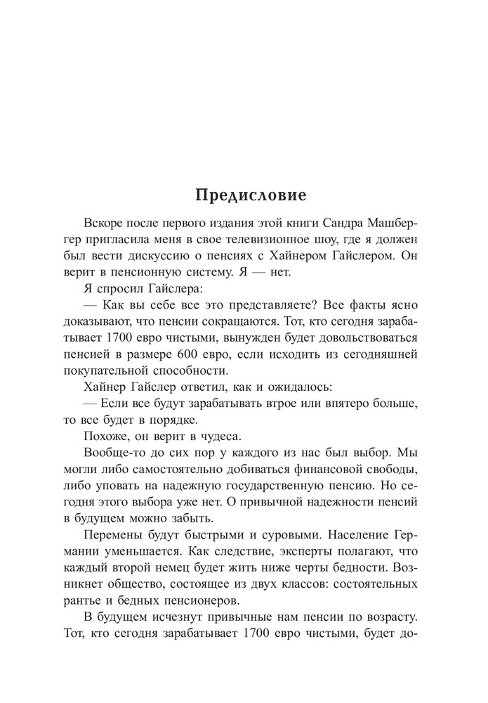 💳 Оплатить за товар можно при получении 🇰🇿 Есть бесплатная доставка по Казахстану от 1 дня 🎁 Копите бонусы с каждой покупки Серия: Бизнес по-европейски Тот, кто полагается на пенсию, никогда не достигнет финансовой свободы! В будущем мы не сможем больше рассчитывать на пенсию по возрасту. Как следствие образуется двухклассовое общество, состоящее, с одной стороны, из богатых людей, сделавших себе частное состояние, и, с другой — из бедных пенсионеров. Но вы не должны опускать руки перед перспективой нищеты в старости! Бодо Шефер познакомит вас с 7 главными правилами, соблюдение которых приведет к финансовой безопасности и свободе. Все действия описаны понятным языком и могут быть немедленно реализованы независимо от того, сколько денег у вас на счету сегодня.* Вы будете буквально притягивать к себе деньги.* Вы научитесь правильно экономить и будете испытывать удовольствие от этого.* Ваши сбережения будут приносить вам доход.* Вы узнаете, как в полной мере использовать льготы, предоставляемые государством.* Вы уже через 3 месяца сможете повысить свой заработок.Бодо Шефер перевернет ваш менталитет. Он даст вам знания, которые можно сразу же начать применять в своей жизни. — Suddeutsche ZeitungОтличный стимул для людей, которые хотят самостоятельно строить свое будущее. — RTL |