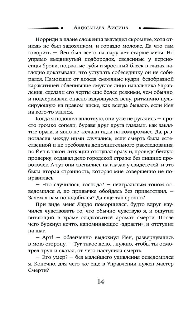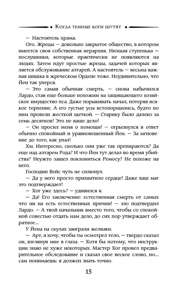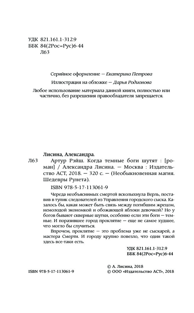 Артур Рэйш. Когда темные боги шутятВ данный момент этот товар отсутствует в продаже. Возможно, у нас найдется аналогичный или похожий товар здесь. Серия: Необыкновенная магия. Шедевры Рунета Череда необъяснимых смертей всколыхнула Верль, поставив в тупик следователей из Управления городского сыска. Казалось бы, какая может быть связь между погибшим жрецом, немолодой экономкой и обожающей яблоки девочкой? Но у богов бывают скверные шутки, особенно если эти боги — темные. И поразившее город проклятие — еще не самое худшее, что могло бы случиться. Впрочем, проклятие — это проблема уже не сыскарей, а мастера Смерти. И городу крупно повезло, что один такой здесь все-таки есть. |