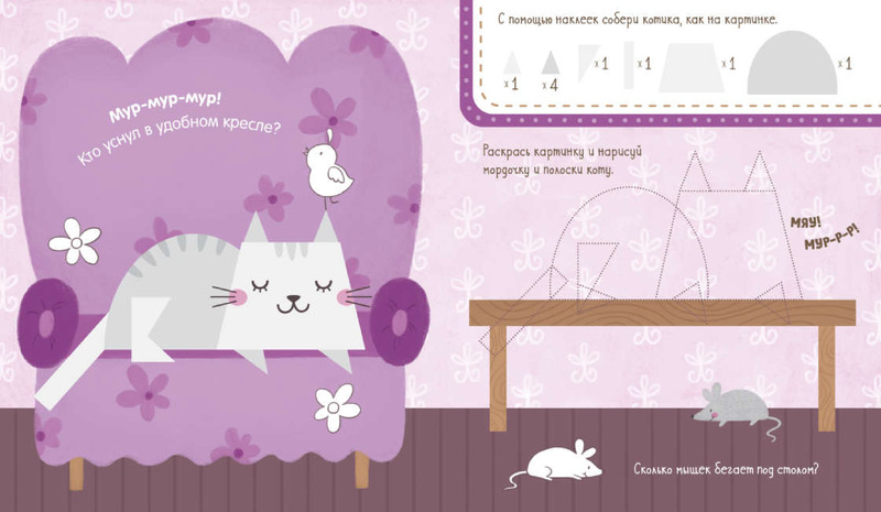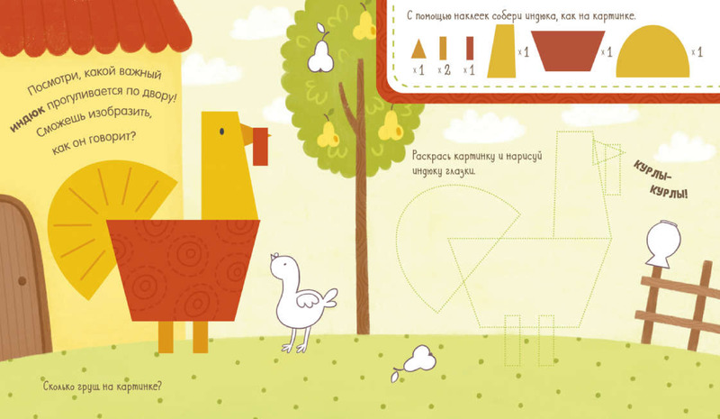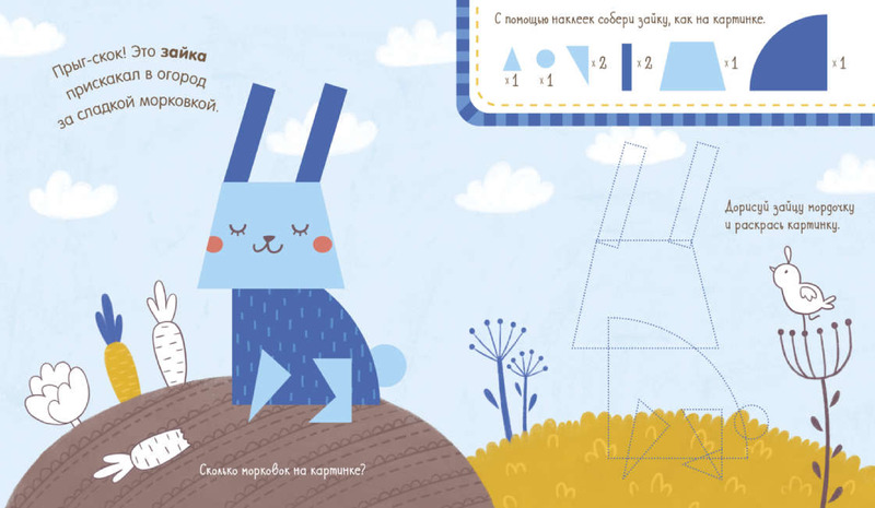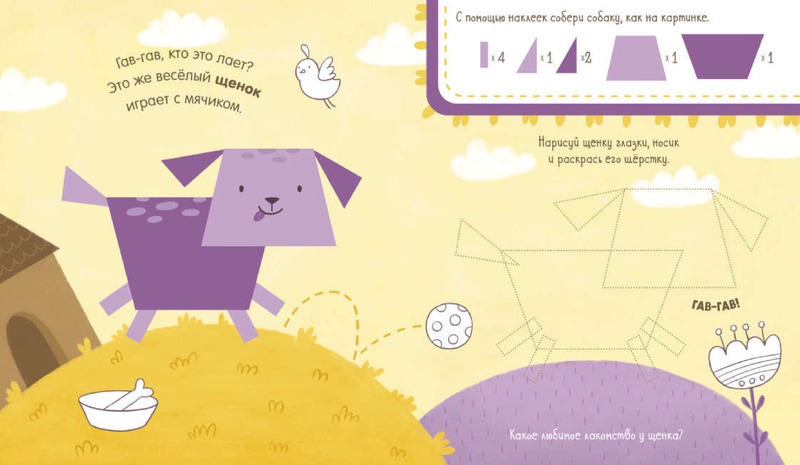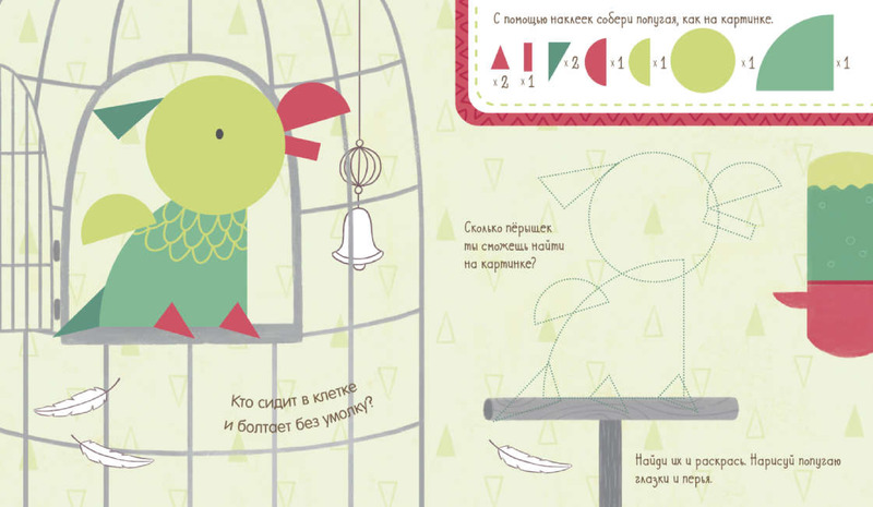 Животные из геометрических фигур, на одной стороне образец животного на другой контур, куда клеить наклейку. Подойдет для детей 3 лет. Можно еще раскрасить что-нибудь на каждой странице. Всего 15 животных. Наклейки хорошо прорезаны, отклеиваются легко.