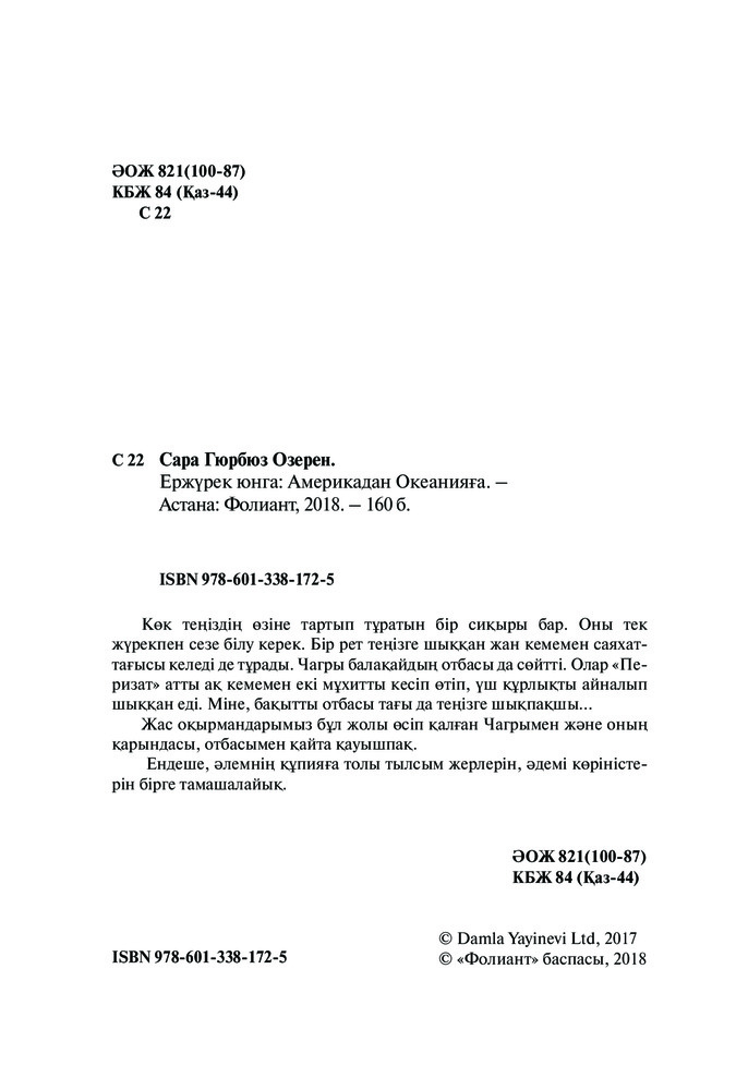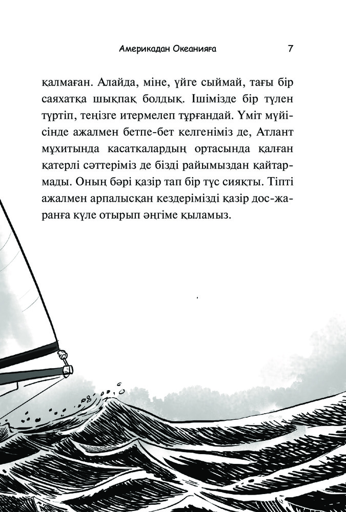 Көк теңіздің өзіне тартып тұратын бір сиқыры бар. Оны тек жүрекпен сезе білу керек. Бір рет теңізге шыққан жан кемемен саяхаттағысы келеді де тұрады. Чагры балақайдың отбасы да сөйтті. Олар «Перизат» атты ақ кемемен екі мұхитты кесіп өтіп, үш құрлықты айналып шыққан еді. Міне, бақытты отбасы тағы да теңізге шықпақшы... |